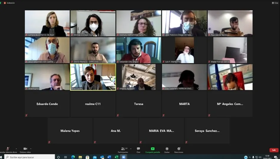 La Cámara de Comercio, Industria y Servicios de Béjar, en colaboración con el Instituto para la Competitividad Empresarial (ICE) ha organizado hoy una videoconferencia en la que han participado 23 empresas, para conocer, desgranar y analizar las ayudas vigentes dirigidas a los diferentes sectores productivos, así como para poner en valor la oportunidad que suponen los fondos Next Generation EU para las empresas bejaranas; de la mano de Susana García, directora del ICE, Rosa Cuesta, directora general de Política Económica y Competitividad y José Francisco Diego, director territorial de ICE en Salamanca.