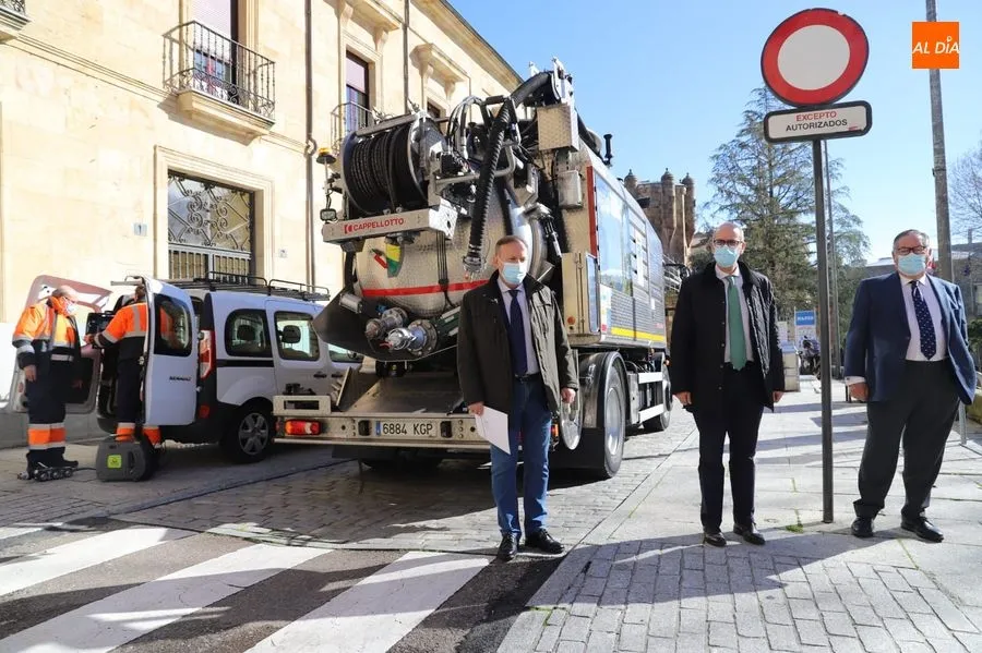 La Diputación de Salamanca ha sumado un nuevo camión a su flota para la limpieza y desatascos de tuberías, un vehículo con una capacidad de 10.300 litros de agua que incorpora además un nuevo servicio con cámaras, que se pueden meter en la red para supervisar el estado de los desagües y facilitar su reparación y correcto funcionamiento.