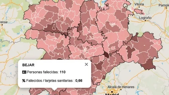 La mortalidad por COVID-19 en la ZBS de Béjar es de 110, tres más en las últimas 48 horas, el 0,66 % de las tarjetas sanitarias. La cifra global se sitúa en 311, cuatro más en los últimos dos días corresponden al 1,89 % de las tarjetas sanitarias registradas en la zona de salud de Béjar. La cifra de 311 fallecidos es un dato global de mortalidad, según los datos oficiales, no vinculados exclusivamente a enfermedad por COVID-19. El cálculo se ha realizado tomando en cuenta las bajas de tarjetas sanitarias, esta tasa se calcula con respecto a la población de cada provincia expresada por mil.