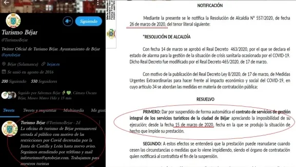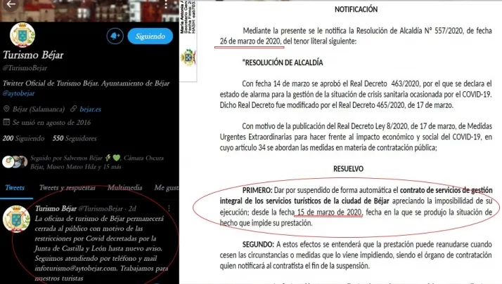 El primer y único movimiento en las redes sociales de la Oficina de Turismo de Béjar, desde que el pasado 31 de diciembre finalizó el contrato con la anterior empresa adjudicataria, ha sido un tuit del día 10 de febrero para comunicar que la nueva persona contratada por el Ayuntamiento realizará su trabajo de forma telemática, mientras las instalaciones permanecerán cerradas al público. Ningún movimiento en redes para divulgar y promocionar los recursos turísticos de la ciudad y de sus alrededores, como venía siendo habitual antes de la remunicipalización del servicio.