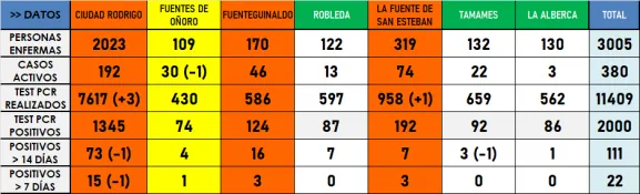 Al igual que ocurre en esas estadísticas por zonas básicas, tampoco hay apenas cambios en los datos por municipios, siendo el único cambio visible que baja mínimamente la incidencia acumulada quincenal en Ciudad Rodrigo, de 538 a 521 casos por cada 100.000 habitantes, lo que equivale a 64 positivos en las dos últimas semanas. Mientras, en lo que respecta a la incidencia semanal, se mantiene como el domingo en 97 casos por cada 100.000 habitantes (12 positivos en números absolutos).