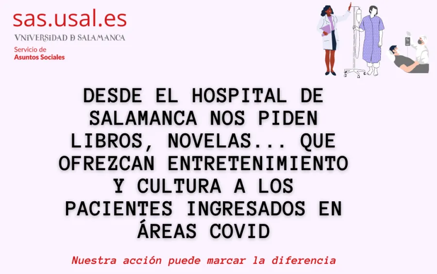 ?Desde el Hospital de Salamanca nos piden libros, novelas? que ofrezcan entretenimiento y cultura a los pacientes ingresados en áreas covid. Nuestra acción puede marcar la diferencia. ¿Participas??. Es el mensaje que el Servicio de Asuntos Sociales de la Universidad de Salamanca ha mandado a docentes, alumnos y el resto de personal de la institución académica.