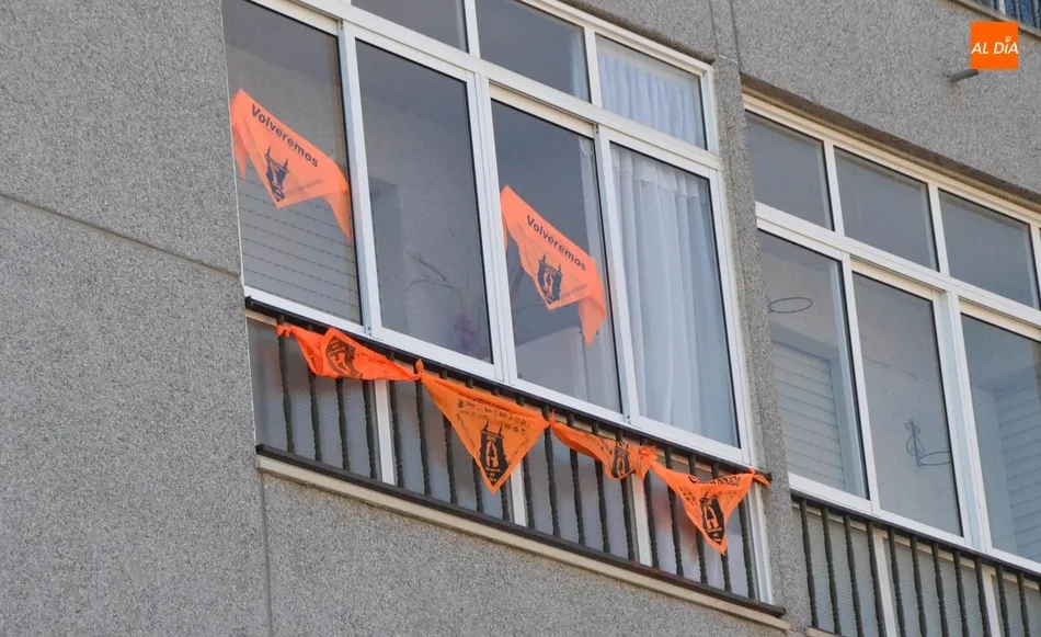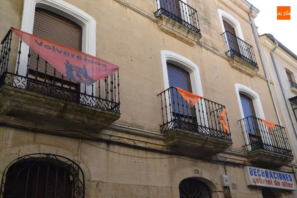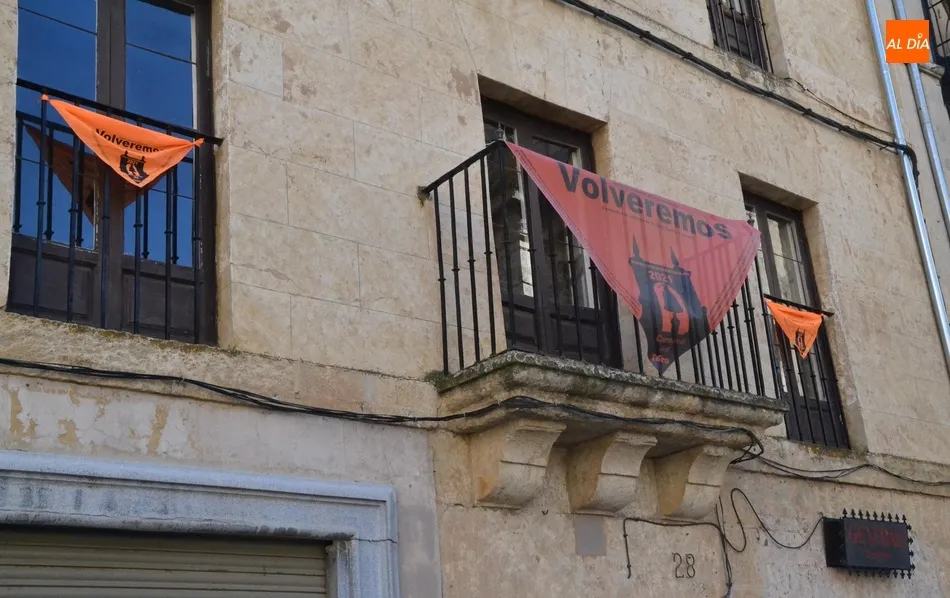 De este modo, prácticamente en cualquier calle de Ciudad Rodrigo se pueden ver pañuelos en algún que otro balcón o ventana, alternándose los repartidos por la Asociación Cultural Carnavaldeltoro.es en ediciones anteriores del Campanazo con otros creados específicamente para este año (que quién los ha querido ha tenido que comprarlos, en Publimir). Esos pañuelos del 2021 lucen un lema, Volveremos, como también se puede apreciar en el ?pañuelo gigante? que cuelga desde el viernes de la fachada de la Casa Consistorial. Precisamente, en las ventanas, balcones y escaparates se alternan los pañuelos de tamaño ?normal? con versiones de tamaño gigante.