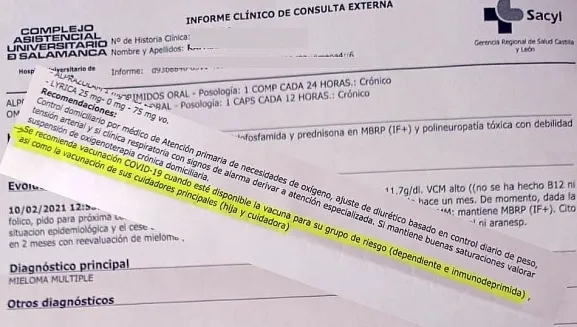 Uno de estos casos lo sufre la hija y la cuidadora de una mujer, residente en uno de los municipios de la zona, que sufre las secuelas de la quimioterapia tras haber sido tratada de un mieloma múltiple. A pesar de que en el informe hospitalario ?se recomienda vacunación COVID-19 cuando esté disponible la vacuna para su grupo de riesgo (dependiente e inmunodeprimida), así como la vacunación de sus cuidadores principales (hija y cuidadora)?, desde el centro de salud de Vitigudino le señalan que el protocolo de vacunación establece, en esta fase inmediata, la vacunación de personas dependientes y mayores de 80 años, por lo que tanto su cuidadora como la hija conviviente, y también cuidadora de la persona enferma, no serían vacunadas. ?Mi madre figura en la lista de vacunación, pero ni a la cuidadora ni a mí está previsto que nos vacunen?, señala la hija, que ha pedido a LAS ARRIBES AL DÍA permanecer en el anonimato por ser una persona muy conocida en la zona.