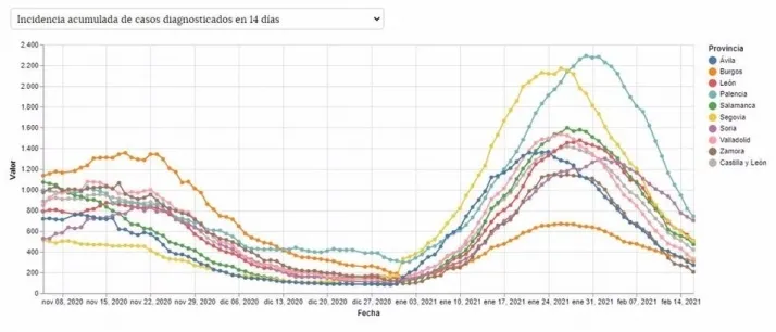 En los datos actualizados este miércoles, el dato regional ha bajado hasta los 420 casos por 100.000, casi la mitad que hace una semana -795 casos el pasado 10 de febrero-. La provincia con mayor tasa de incidencia es Palencia, con 742 casos por 100.000; seguida por Soria, con 702; León con 506; Segovia, con 504; y Salamanca, con 473 casos. Por debajo del dato regional se encuentra Valladolid, con 329 casos por 100.000; Burgos, con 311; Ávila, con 271 y Zamora, con el dato más bajo, 205 casos por 100.000.