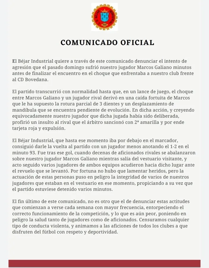 El Béjar denunció un intento de agresión al jugador Marcos Galiano por parte de aficionados de la Bovedana. El futbolista perdió tres dientes y un desplazamiento por una acción del partido y terminó expulsado por insultar a un rival por el enfado durante el pasado fin de semana.