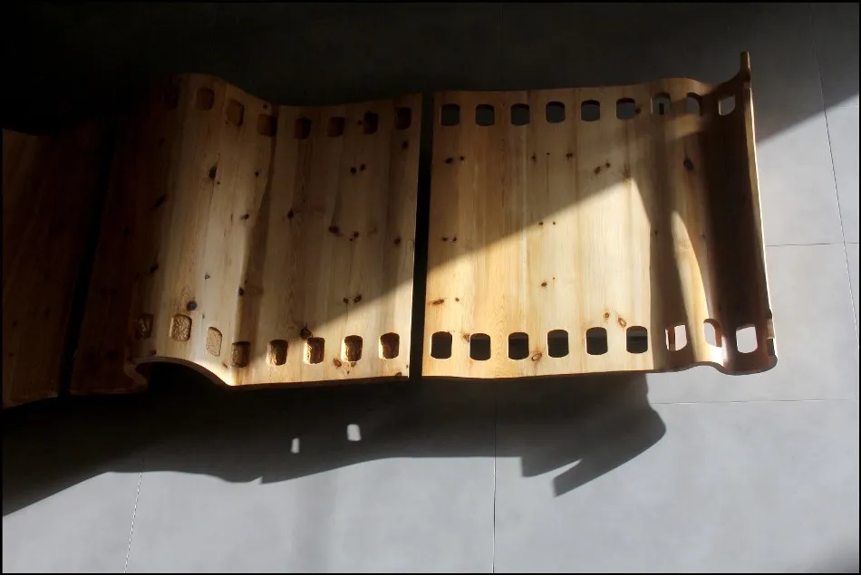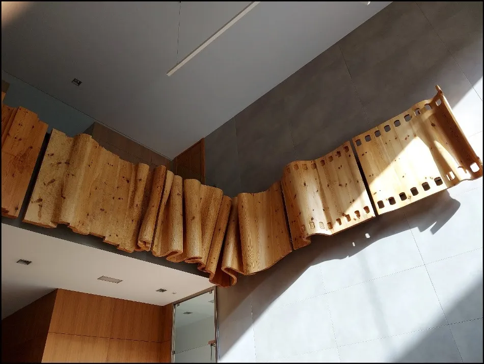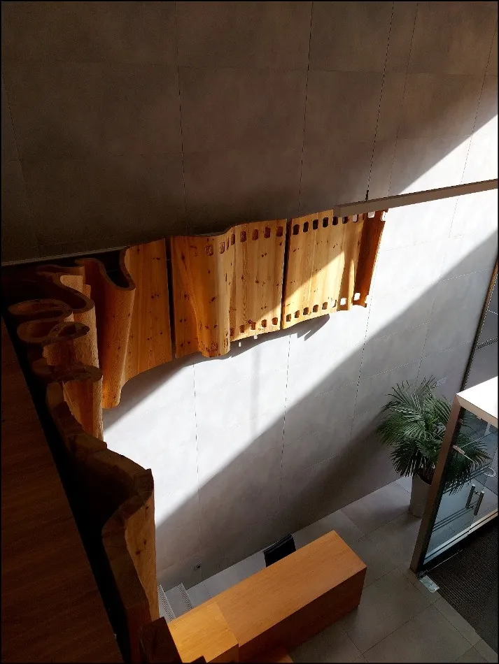 Pieza privada, desde la calle nos interpela con su impresionante factura, pero es dentro del portal donde desenvuelve del todo su maestría. Acceder a ella requiere de permisos y paciencia, pero es paciencia lo que a Amador Martín le sobra en sus recorridos por Salamanca buscando la esencia de una ciudad que se adorna de piezas artísticas que los particulares tienen la valentía de encargar a los creadores. Y el creador siempre reflexivo que es Andrés Álvrez Ilzarbe, desenrolla para el fotógrafo su empeño convertido en esa madera que trabaja, dúctil y expresiva, en su inconfundible obra: el resultado final es el fruto del trabajo, del talento, del tiempo, del esfuerzo? La pieza parte del caos, la inspiración, la madera sin desbastar, forma primigenia? sin embargo el proceso, ese que tiene un momento álgido de intensidad creadora, acaba alumbrando esa obra de arte, película, pieza escultórica que nos sorprende por su belleza.