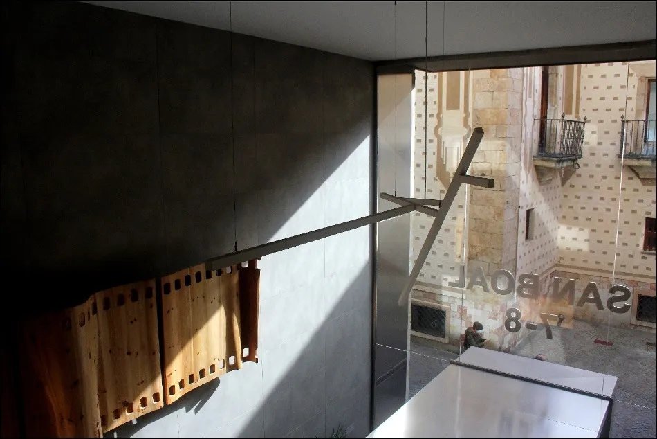 Andrés Álvare Ilzarbe eligió la madera y sus palabras son como ramas sabias que extienden sus dedos a través de la distancia. La vida, compleja, caótica, plena y confusa, se convierte en arte y armonía. Y se despliega ante nuestros ojos. Cristal y metal, el edificio refleja para el fotógrafo la plaza antigua, la iglesia medieval, el muro del palacio de piel esgrafiada. Y dentro del cristal, al abrigo de toda perturbación pero ante los ojos de quienes pasan, la obra de Ilzarbe sigue recordándonos un tiempo de cine, de constancia empresarial, de sueños y años en la ciudad de la memoria que permanece. Y es el paso sosegado, constante, tenaz del fotógrafo de la luz el que se detiene para desenrollar un tiempo de celuloide convertido en madera con la profunda intensidad de Álvarez Ilzarbe. Ahí a la vuelta sigue pasando la película de nuestros pasos por la ciudad de cine? ecos de un tiempo detenido en el negativo de la memoria.