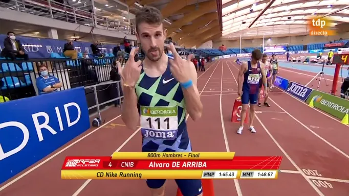 Álvaro de Arriba se proclamó en la tarde del domingo en el Polideportivo Municipal Gallur de Madrid campeón de España en Pista Cubierta de los 800 metros lisos. Lo hizo con una tremenda exhibición en la final, que dominó literalmente de principio a fin, firmando su mejor marca de la temporada (aunque de momento sólo ha disputado tres carreras), y sacando el billete para el Campeonato de Europa Indoor que se disputará dentro de dos semanas.
