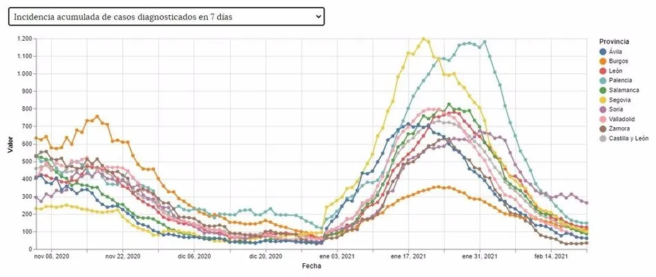 Por provincias, todavía se sitúan por encima de ese nivel Soria, con 263 casos por cada 100.000 habitantes; seguida por Palencia, con 147 casos; León, con 124; y Burgos, con 112 casos por 100.000 habitantes, donde además se produce un ligero crecimiento con respecto al dato de la jornada anterior.