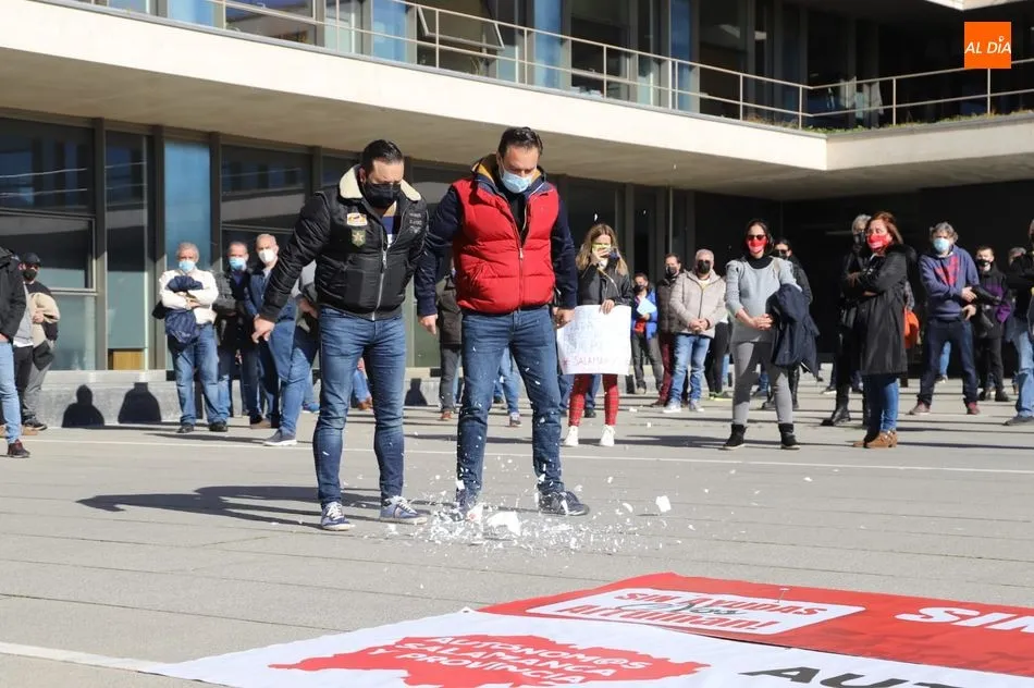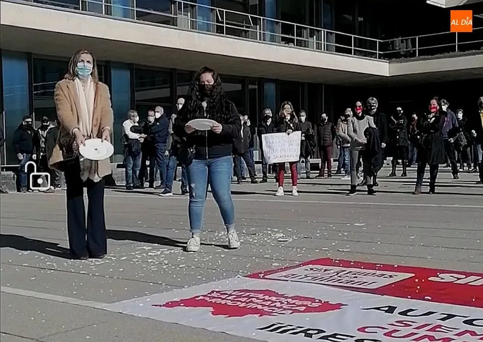 En Salamanca, decenas de profesionales de hostelería se concentraban ante la delegación de la Junta, en la calle Príncipe de Vergara, donde expusieron sus reivindicaciones y rompieron platos contra el suelo, para simbolizar que a este sector le toca ?pagar los platos rotos?.