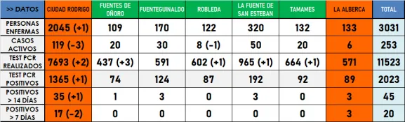 Los datos de este martes de la Zona Básica de Salud de Ciudad Rodrigo se completan con una persona enferma más y tres casos activos menos. Asimismo, también pierde un caso activo la Zona Básica de Robleda, que sigue siendo la 2ª de la comarca con menos casos en estos momentos, sólo por detrás de la Zona de La Alberca, que acumula 6.