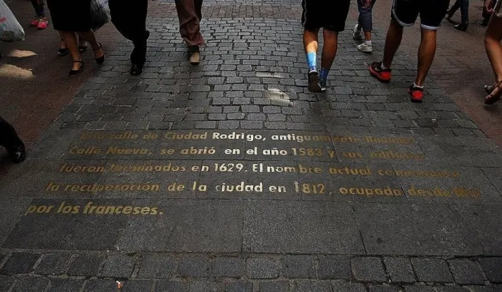 Según señala el alcalde Martínez-Almeida en su misiva, el suelo de adoquines de piedra y las losetas de granito de la vía ?sufrían mucho por el tráfico rodado continuo de transporte pesado de reparto?, lo que provocaba ?un gran deterioro en las letras, que además eran vandalizadas?. Ante ello, en las últimas obras realizadas en esa Calle Ciudad Rodrigo por parte de la Dirección General de Conservación de Vías Públicas del Ayuntamiento de Madrid, se decidió retirar ?los adoquines, las losetas de granito y también las letras de latón?.