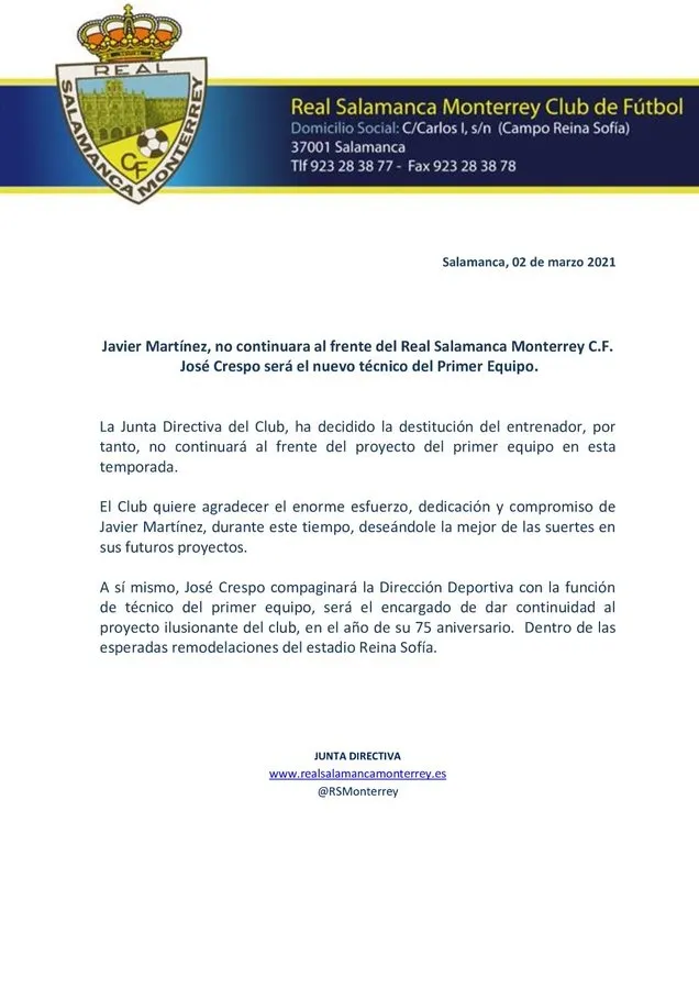 El RS Monterrey, de la Primera Regional de Aficionados, despidió al entrenador Javier Martínez. Mientras, Pepe Crespo se hará cargo de su puesto y lo compaginará con las funciones de director deportivo.