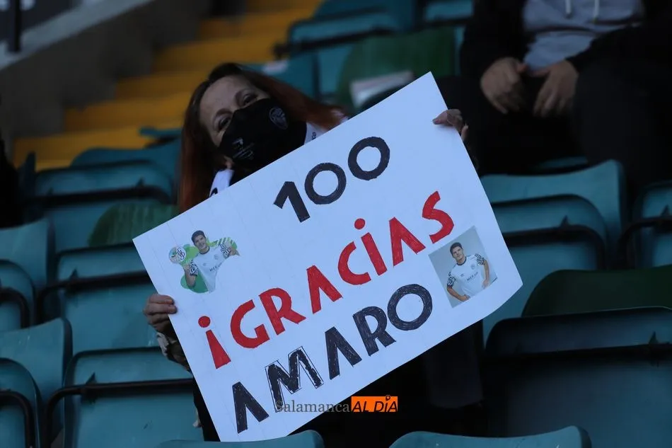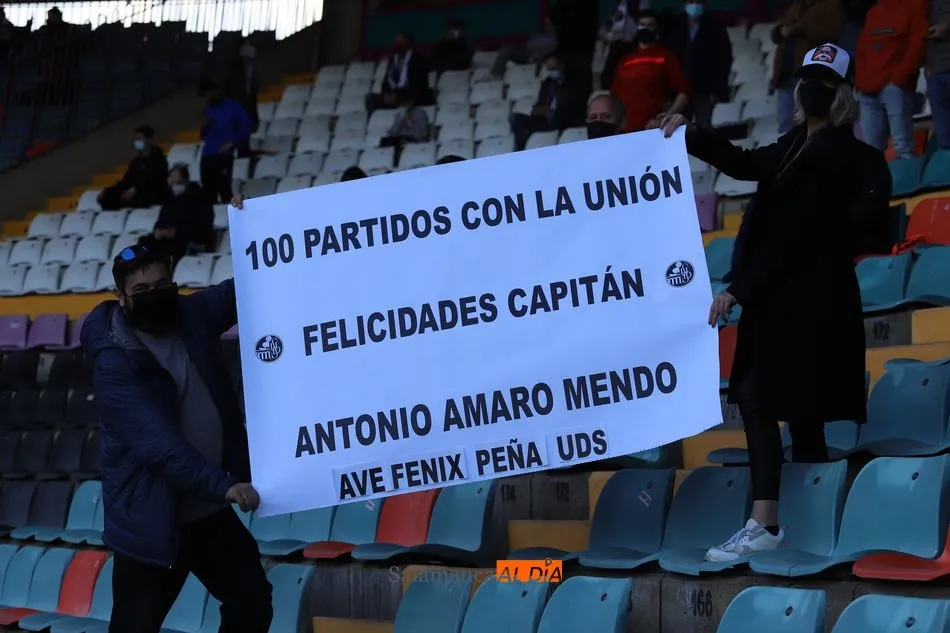 El Helmántico se rindió a Antonio Amaro por sus 100 partidos con el Salamanca UDS. La afición charra mostró su respeto al capitán en un sentido homenaje tras convertirse en centenario en el club de sus amores en la tarde de este domingo 7 de marzo de 2021, una fecha que el centrocampista no olvidará nunca.