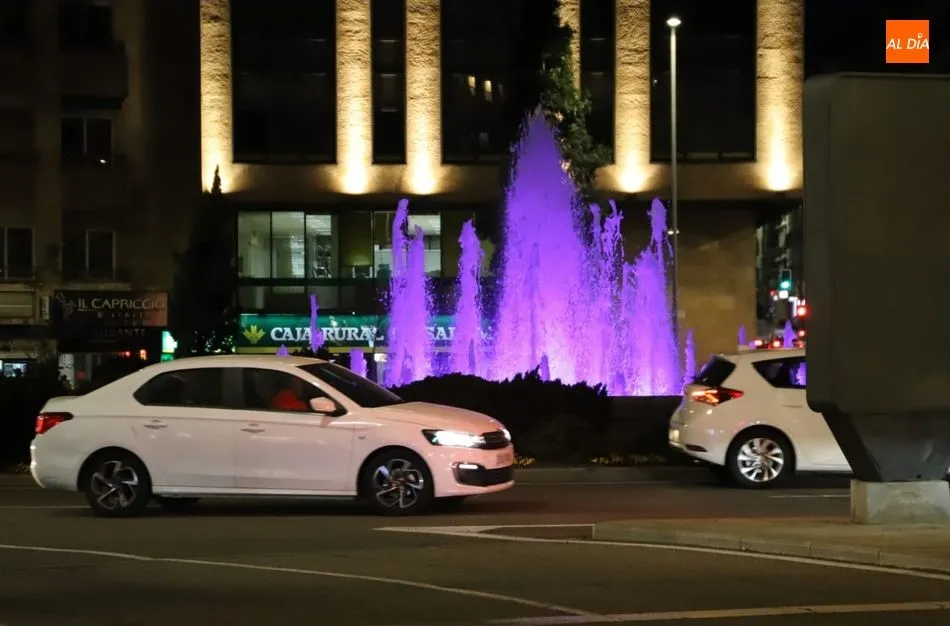 En la noche de este lunes la fuente de la Puerta Zamora y la fachada del Teatro Liceo se han iluminado de color morado para conmemorar la celebración del Día Internacional de la Mujer, dentro de las actividades organizadas por el Ayuntamiento de Salamanca en este 8M marcado por la pandemia.