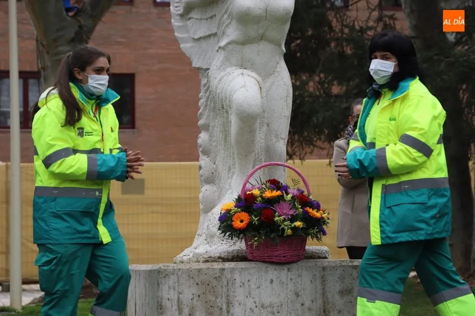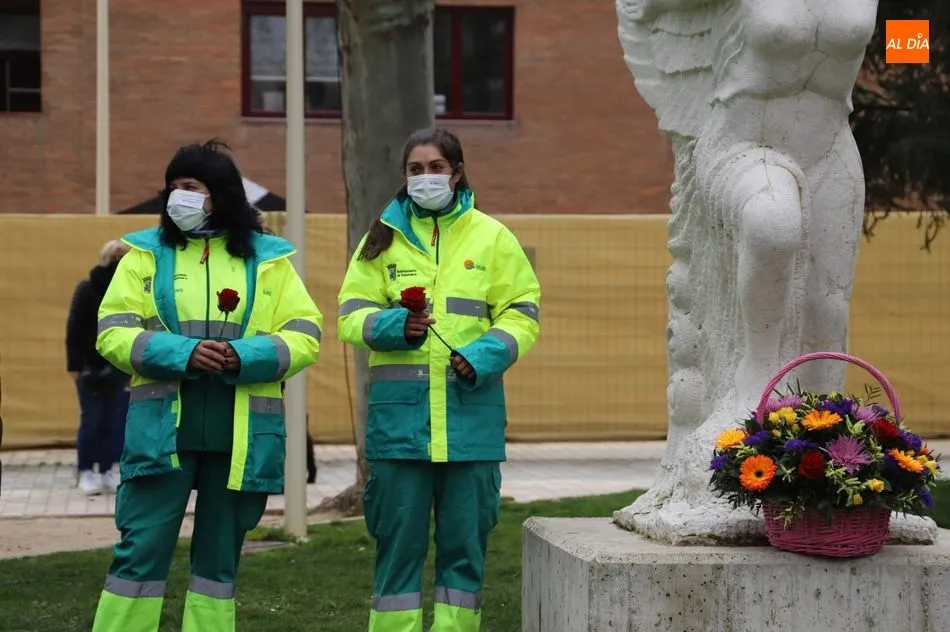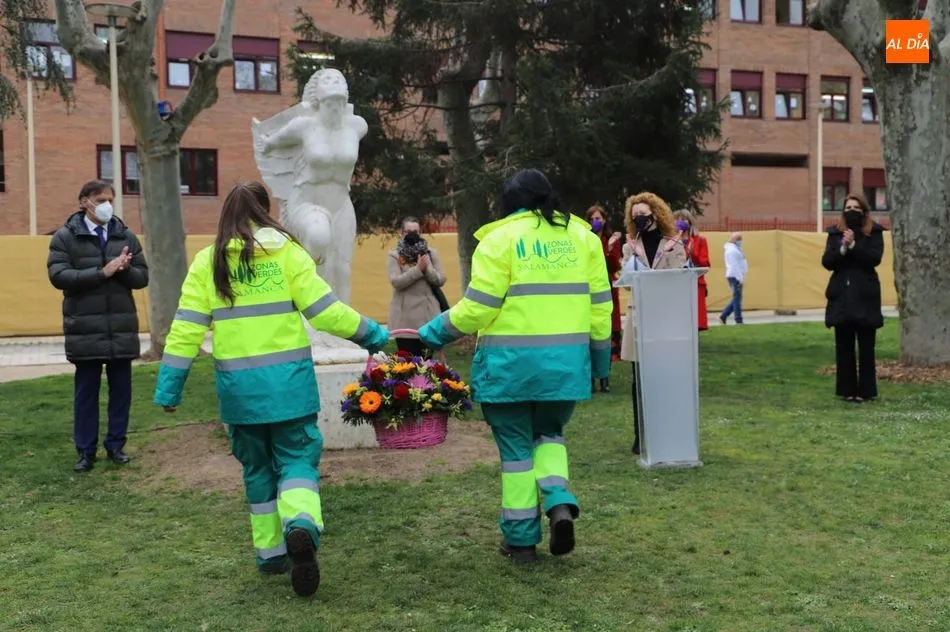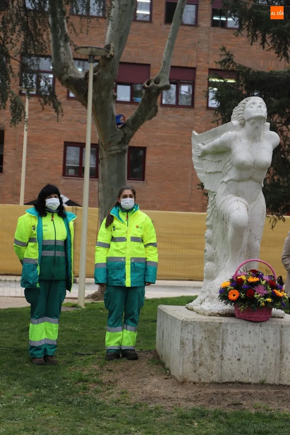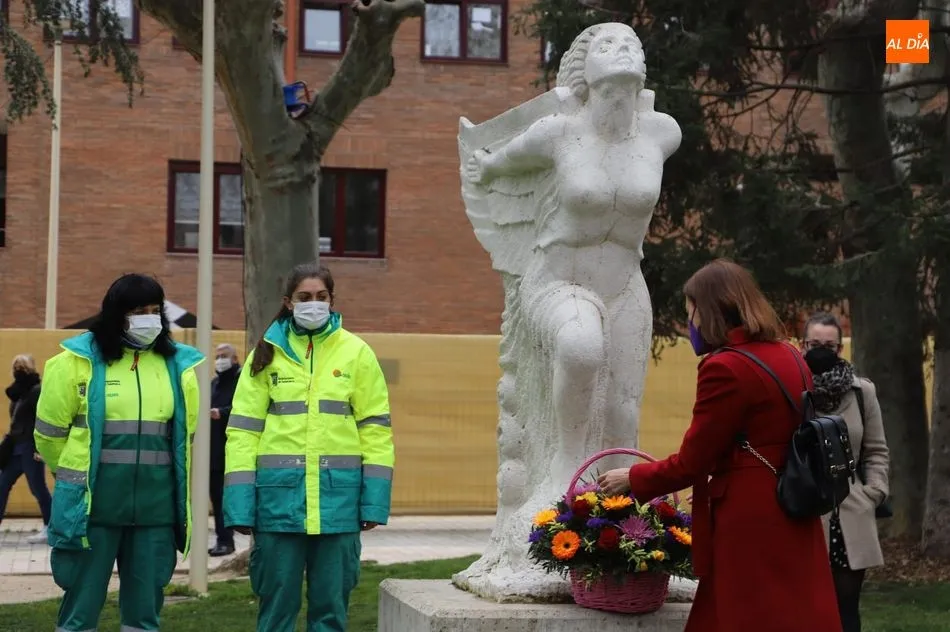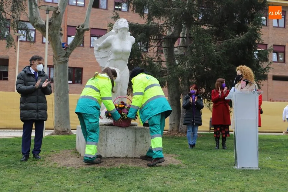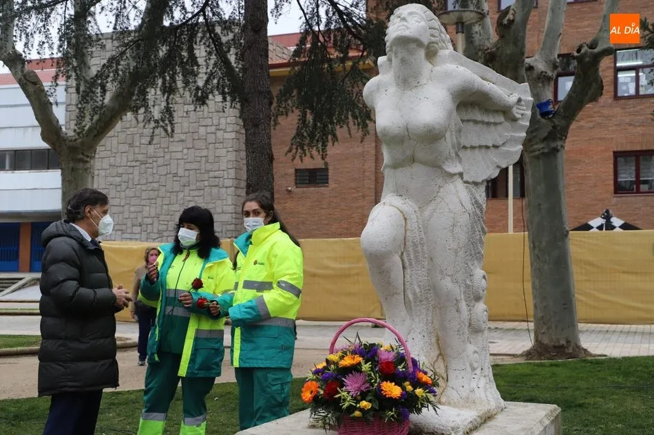 Tras la lectura se llevó a cabo la ofrenda floral, realizada por Laura Martín y Virginia Vicente, trabajadoras del servicio municipal de Parques y Jardines, quienes colocaron un ramo de flores a los pies de la escultura ?Victoria? en representación de todas las mujeres que se homenajean en esta fecha.