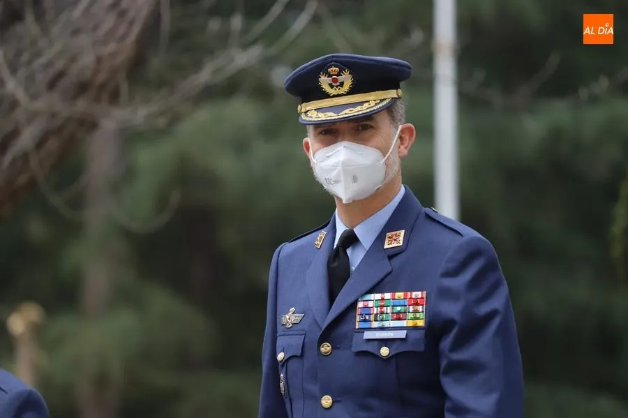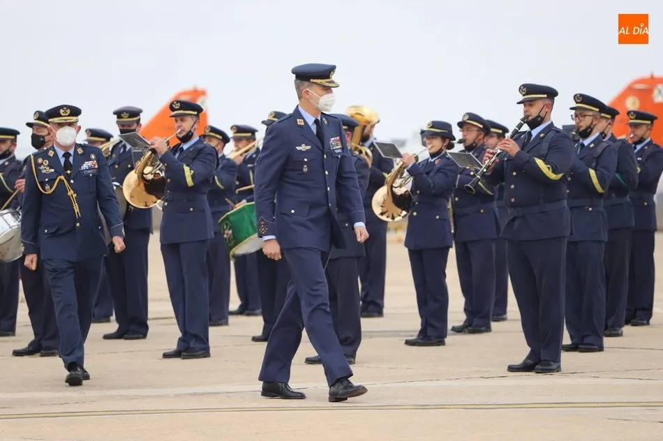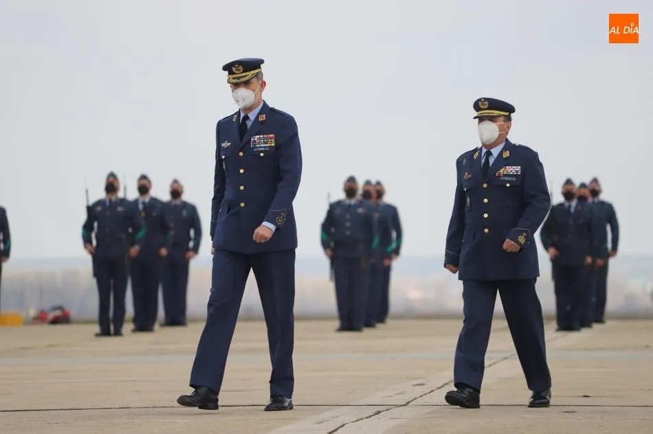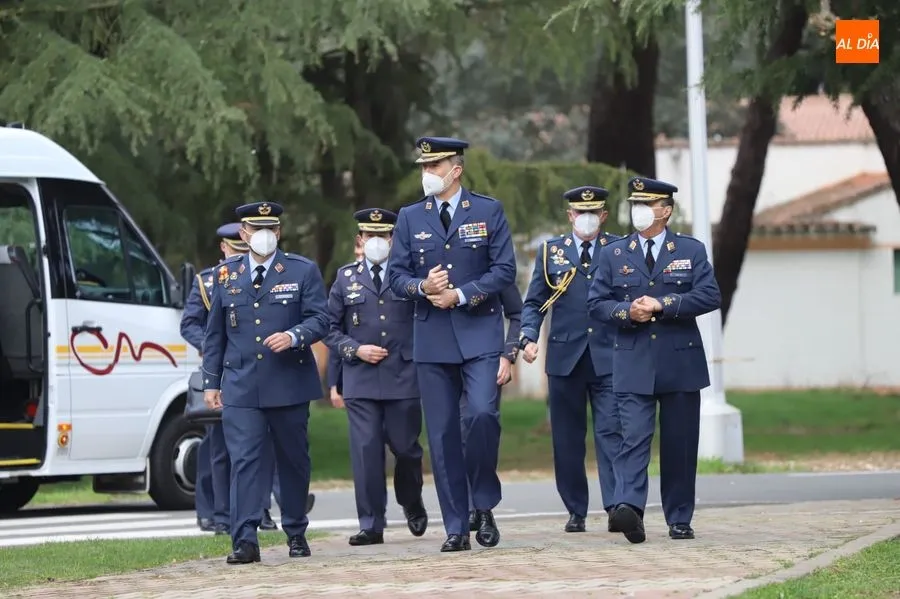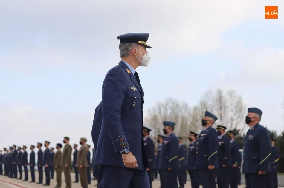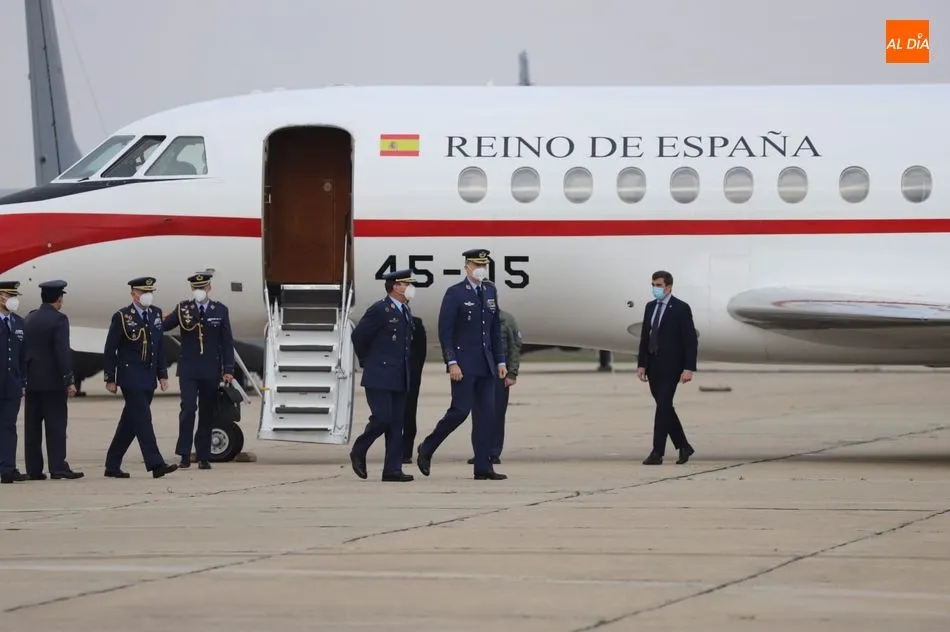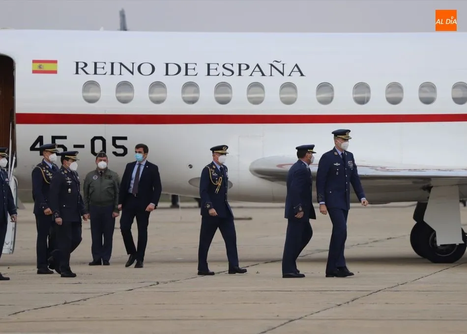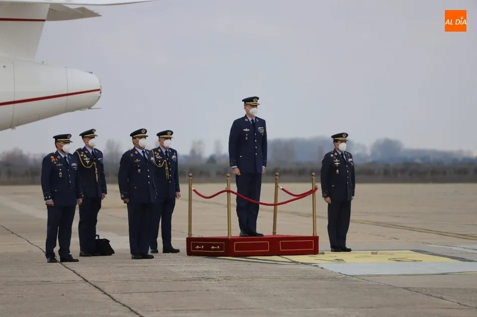 El rey Felipe VI ha llegado a las 10.00 horas a Salamanca, a la Base de Matacán, en un avión del Fuerza Aérea Española, del que bajaba ataviado con el uniforme del Ejército del Aire. El monarca era recibido con honores y pasaba revista a las tropas, tras escuchar el himno nacional, interpretado por la banda militar.