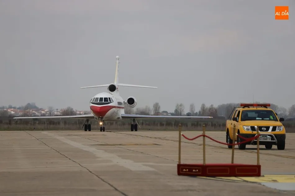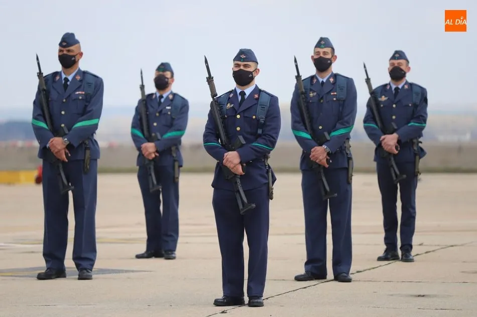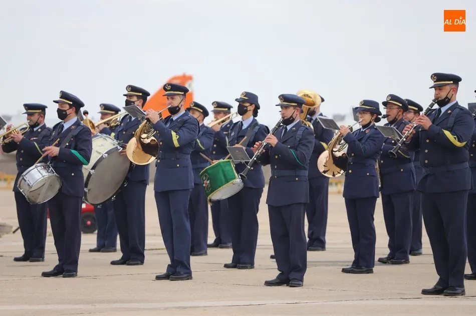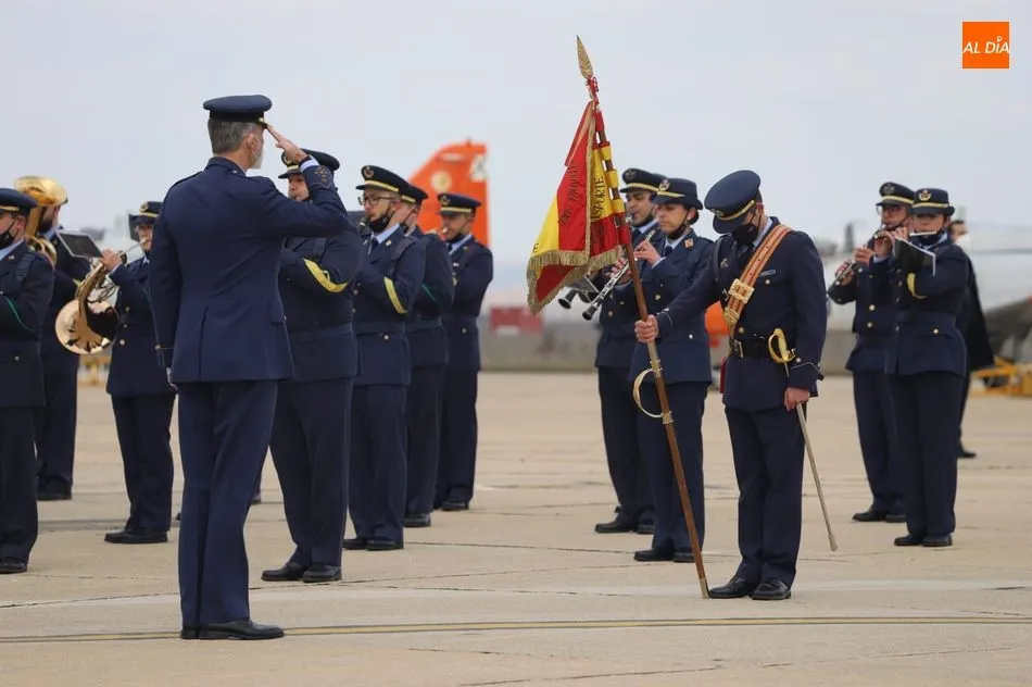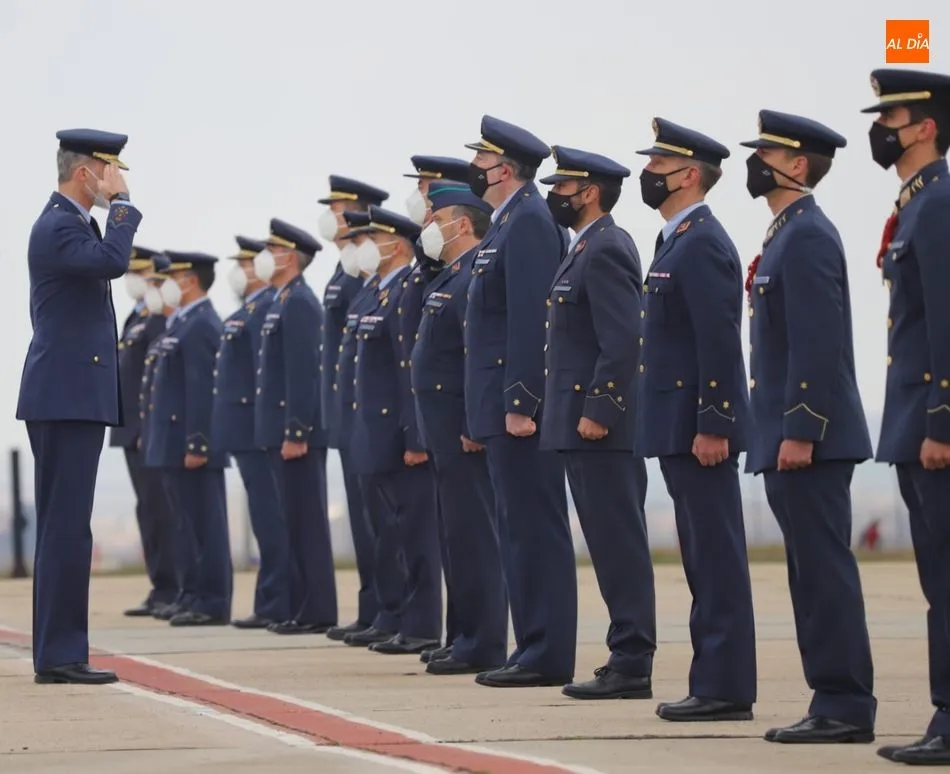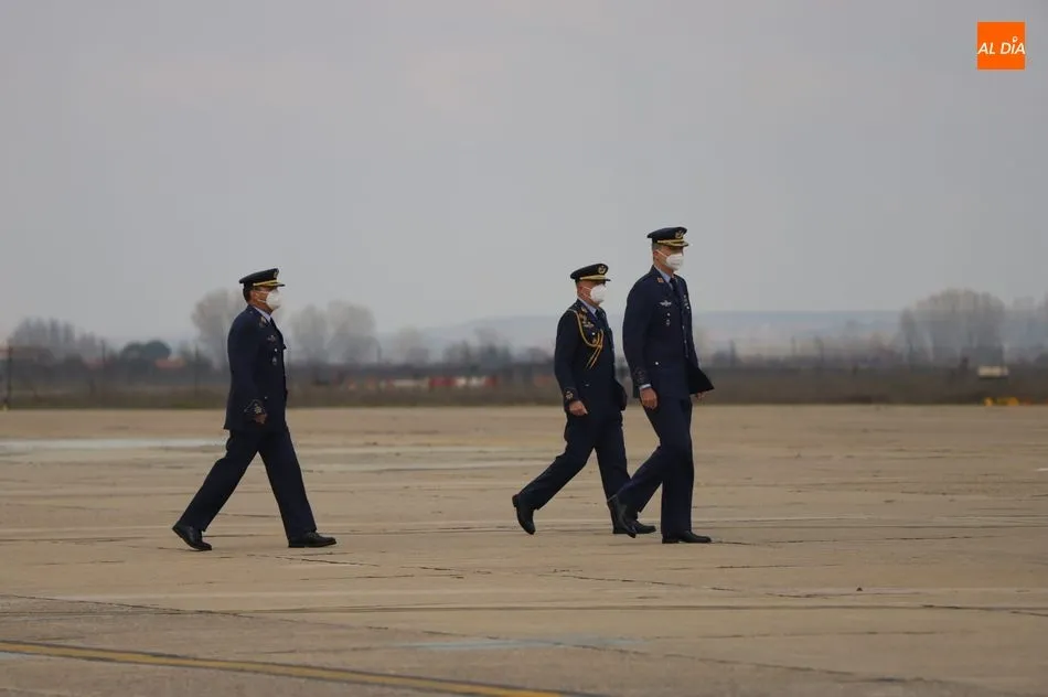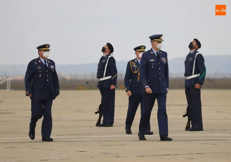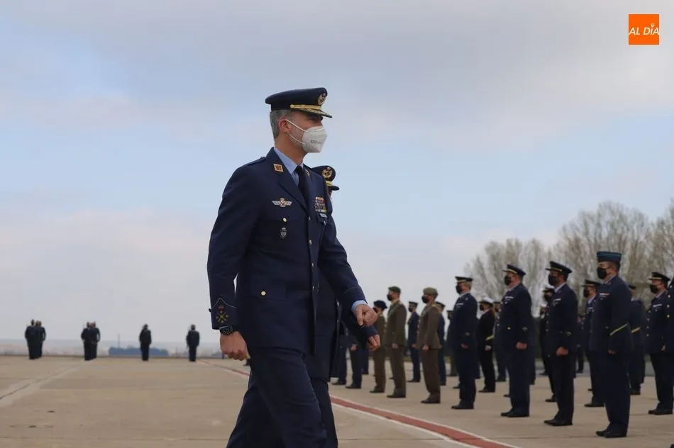 El rey Felipe VI ha llegado a las 10.00 horas a Salamanca, a la Base de Matacán, en un avión del Fuerza Aérea Española, del que bajaba ataviado con el uniforme del Ejército del Aire. El monarca era recibido con honores y pasaba revista a las tropas, tras escuchar el himno nacional, interpretado por la banda militar.