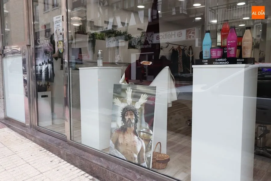 Comerciantes y hosteleros de las calles Wences Morenos, Isidro Segovia, Fray Luis de Granada y Muñoz Torrero, en el barrio del Oeste, se han unido para divulgar la Semana Santa de Salamanca mediante el montaje de escaparates con hábitos, enseres y carteles de las 18 cofradías.
