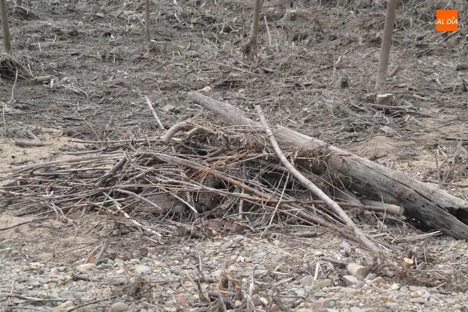 Amén de esos árboles que han quedado ahora en mitad del cauce, hay otro problema adicional, que la operación de limpieza aún no se ha culminado: como los días en que se estuvo realizando la intervención se puso a llover y el río venía más crecido, no se llegaron a recoger todos los restos, pudiéndose observar en estos momentos, ya con el río con un caudal normal, varios montones de ramas que quedaron acumulados en varios puntos.