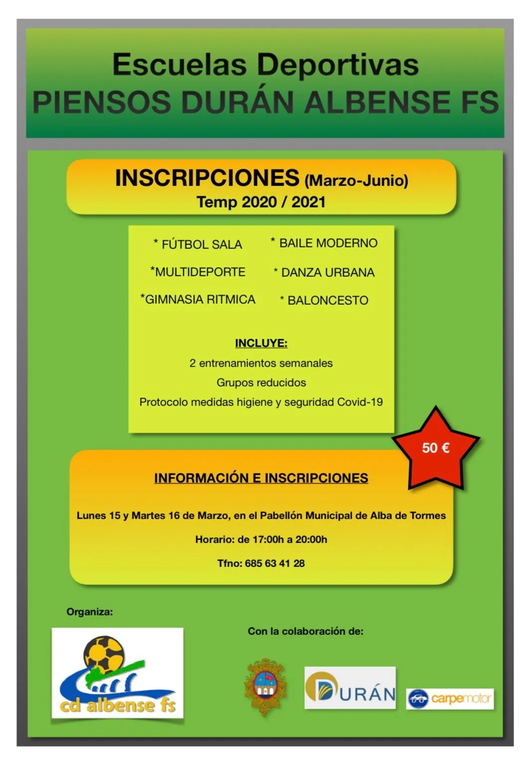Las Escuelas del Piensos Durán Albense regresan desde este mes de marzo y hasta el próximo mes de junio tras la aprobación por parte de la Junta de Castilla y León del Programa de Deporte en Edad Escolar. Desde el Club Deportivo Albense ya se ha abierto el plazo de inscripción para que todos aquellos interesados puedan apuntarse.
