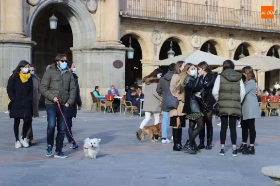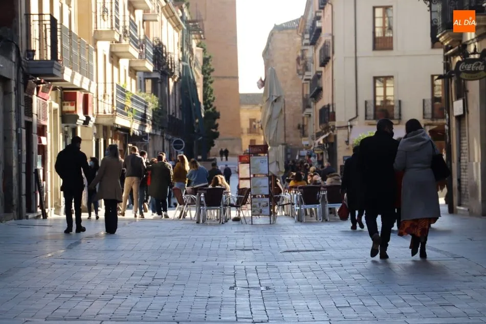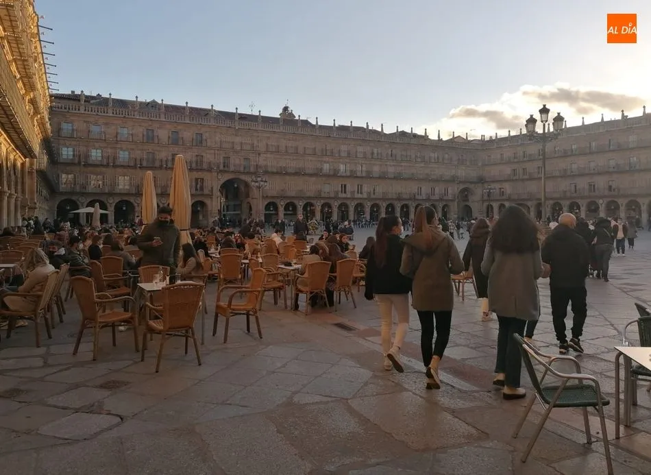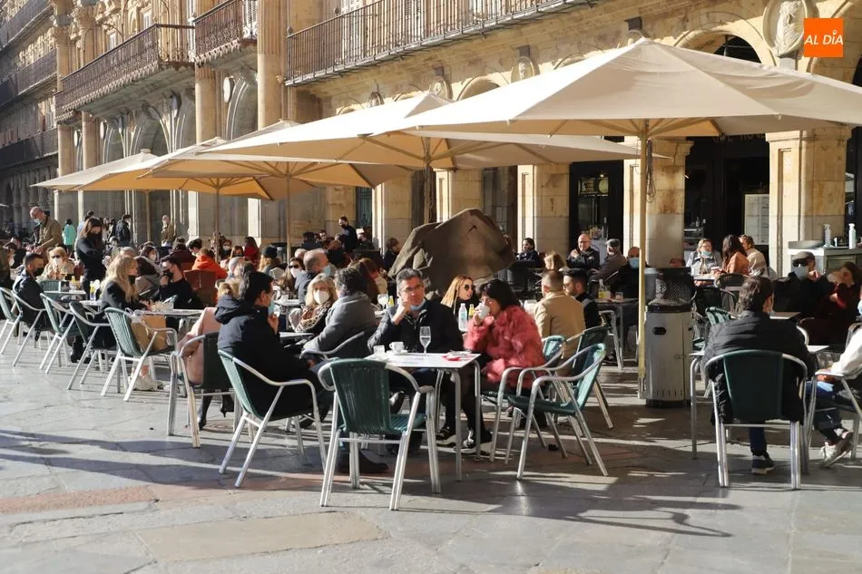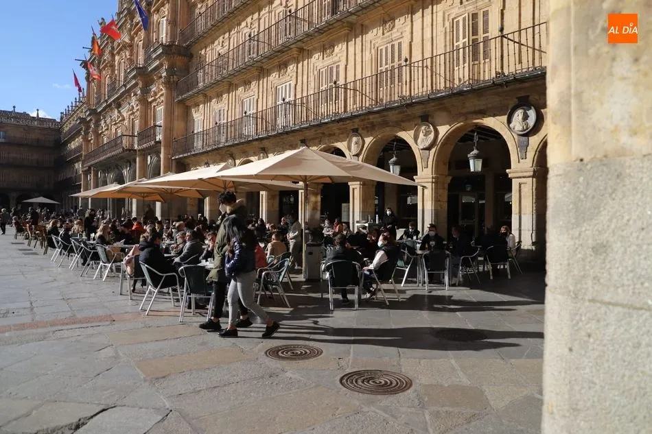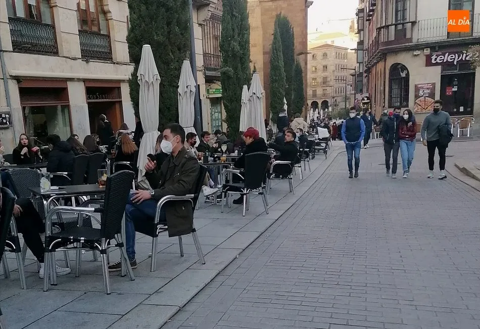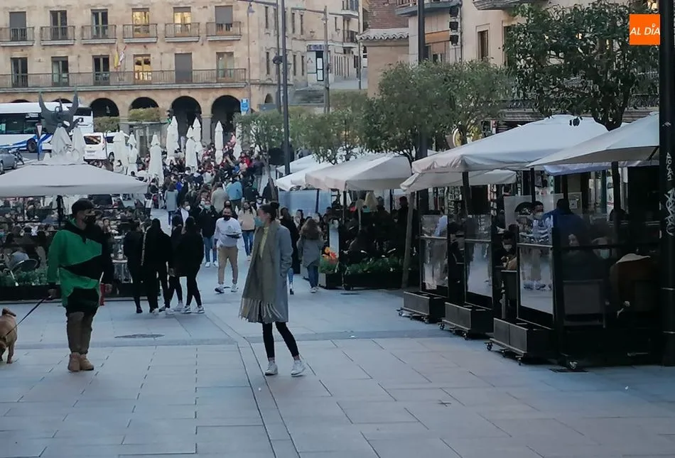 Pese a unas temperaturas más bajas que en sábados anteriores, la relajación de medidas restrictivas en todos los ámbitos ha invitado a los vecinos de Salamanca a pasear por la ciudad, especialmente en los establecimientos hosteleros del centro de Salamanca. Buenas jornadas para las terrazas que sirven de inyección para el sector hostelero sin excesos en los aforos en la inmensa mayoría de los casos.