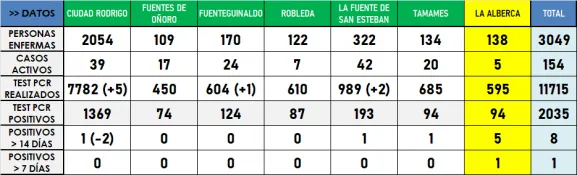 Si se amplía la mirada a las 7 zonas básicas de salud por las que se reparten los 54 municipios de la comarca, la cifra sube a 8 positivos en 14 días, ya que en municipios de la Zona de La Alberca que no pertenecen a la comarca mirobrigense se han registrado hasta 5 casos en las últimas dos semanas, sólo 1 de ellos en los últimos 7 días.