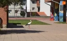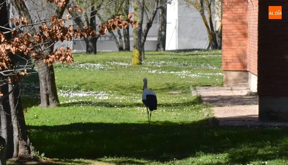 El IES Fray Diego Tadeo de Ciudad Rodrigo recibió durante la mañana del lunes, en pleno horario lectivo, una singular ?visita?, la de una cigüeña, a la cual se pudo ver pasear tranquilamente por el recinto nada lejos de las entradas habituales al edificio principal del centro. Tras estar merodeando por allí, acabó por irse a rodear el edificio del salón de actos, de nuevo ?paseando? con total calma. En torno a estos animales, hay que señalar que durante estas semanas se pueden ver nidos en varios puntos de Ciudad Rodrigo, incluido en el abandonado Convento de Santa Clara, vecino del IES Fray Diego Tadeo.