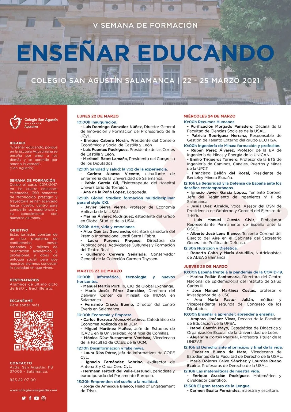 El lunes 22 de marzo comienza la V Semana de Formación ?Enseñar educando? en el Colegio San Agustín, que se prolongará hasta el jueves 25 de marzo y acercará, "virtualmente", a lo largo de la semana, a más de 40 ponentes de reconocido prestigio y trayectoria hasta el centro.