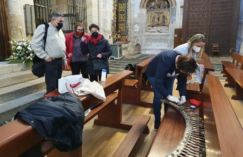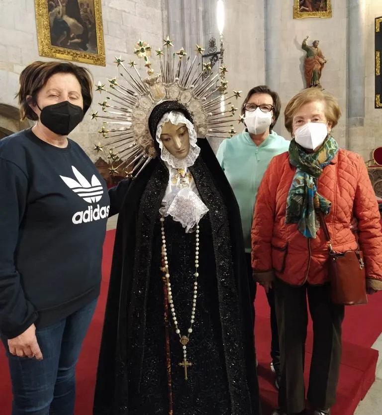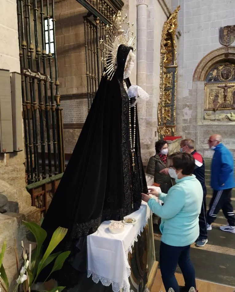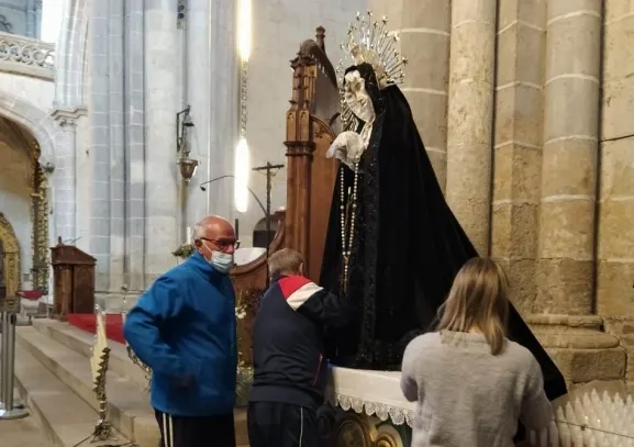 Como cada año en las vísperas de la Semana Santa, los responsables de la Cofradía de Nuestra Señora de La Soledad de Ciudad Rodrigo estuvieron preparando en la tarde del miércoles en la Catedral de Santa María la imagen de la Virgen, trasladándola de la Capilla en la que se encuentra habitualmente hasta las inmediaciones del altar mayor de la Seo. Este año, como la imagen no va a salir en procesión, no fue colocada como es tradición en estas fechas en su carroza, y tampoco en las andas con las que procesiona en septiembre por el interior de la Catedral, siendo únicamente situada sobre una mesa, eso sí, con sus ropajes de gala.
