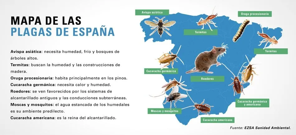 A grandes rasgos, ocho plagas dominan el territorio peninsular, repartidas en cuatro grandes zonas: norte, sur, centro y oeste, y este. Así, en el sur prolifera la cucaracha americana, así como moscas y mosquitos, especialmente en época de calor y en zonas de humedales. El centro y el oeste son territorio para la cucaracha germánica y los roedores. En el este, lideran el ranking de plagas la cucaracha germánica y la americana. Esta última es la reina del alcantarillado, aunque ya le va cogiendo el gusto a las casas particulares, bares y restaurantes. En la zona de Cataluña, también deben hacer frente a las termitas, mientras la oruga procesionaria, que habita principalmente en los pinos, se ceba especialmente en Aragón