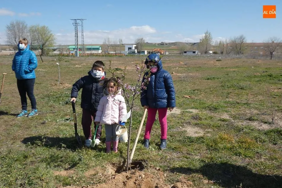Niños de Aldearrubia y otras localidades han participado en la plantación de cien frutales en la Rinconada
