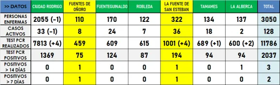 Esos datos por zonas básicas de salud se completan como es habitual con la suma de una nueva serie de pruebas PCR, en este caso un total de 11, 4 de ellas en la Zona Básica de La Fuente de San Esteban, que ya supera las 1.000 pruebas realizadas desde que se desató la pandemia del coronavirus, de las que han dado positivo 194. Como se puede ver también en la tabla, es la 2ª zona donde más pruebas se han hecho, a muchísima distancia (algo lógico teniendo en cuenta el volumen poblacional de cada una) de la Zona de Ciudad Rodrigo, que va camino de las 8.000. Hay que recordar que la Zona de La Fuente está integrada por Boada, Buenamadre, Cabrillas, Castraz, El Cubo de Don Sancho, La Fuente, Martín de Yeltes, Pelarrodríguez, Retortillo, La Sagrada y San Muñoz.