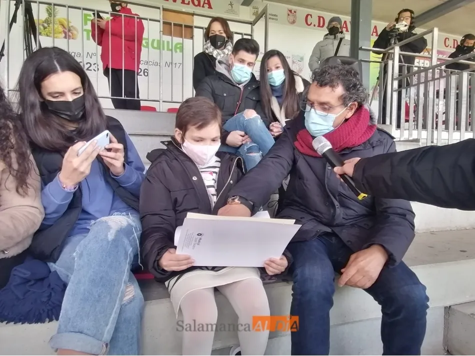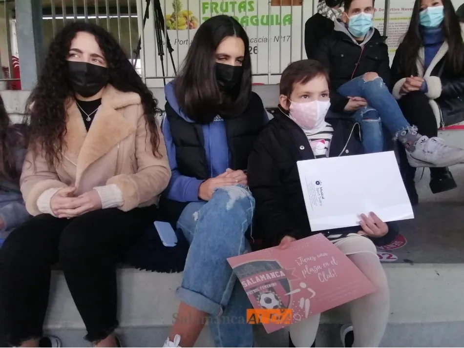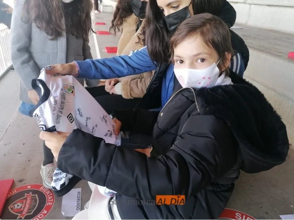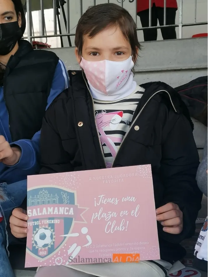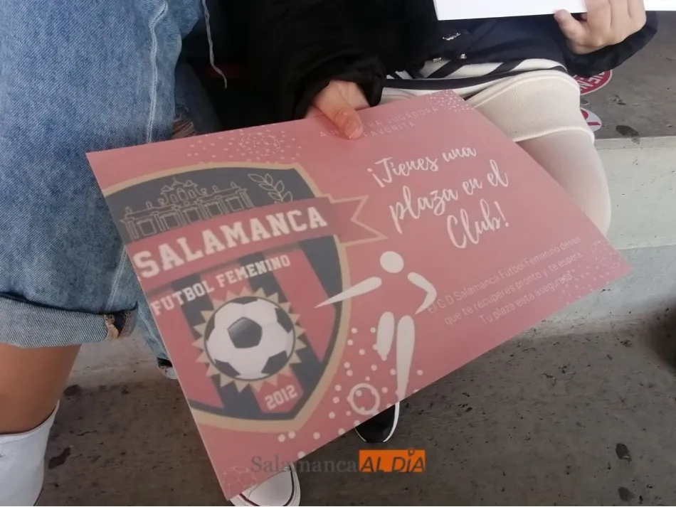Además, el club charro le entregó un cartel en el que ponía un mensaje de que su plaza estaba ?asegurada? tras su recuperación de una grave enfermedad. Por otro lado, el pasado fin de semana, María Caamaño vio el derbi entre el Salamanca UDS y Unionistas en un palco del Helmántico y le regalaron también dos elásticas.