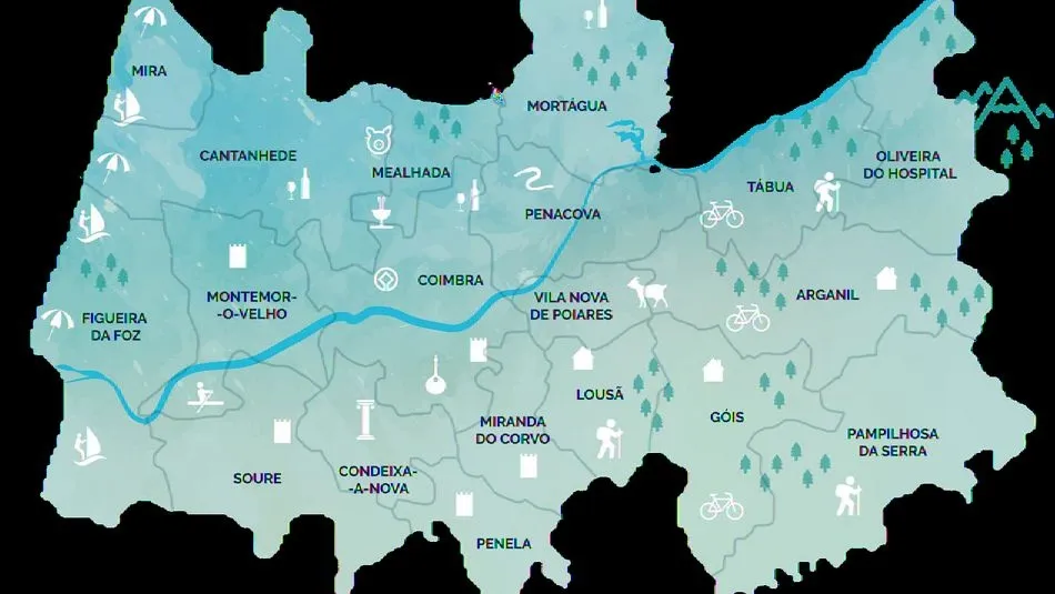 19 municipios: Arganil, Cantanhede, Coímbra, Condeixa-a-Nova, Figueira da Foz, Góis, Lousã, Mealhada, Mira, Miranda do Corvo, Montemor-o-Velho, Mortágua, Oliveira do Hospital, Pampilhosa da Serra, Penacova, Penela, Soure, Tábua e Vila Nova de Poiares.