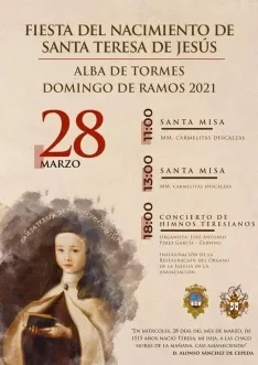 Alba de Tormes celebra este fin de semana el nacimiento de santa Teresa de Jesús. Este año coincide el nacimiento de Santa Teresa de Jesús con la celebración del Domingo de Ramos. Además de la programación organizada por las cofradías y la parroquia de Alba de Tormes para esta Semana Santa, se une la celebración del nacimiento de Santa Teresa de Jesús.