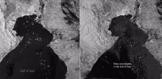 La superficie del mar refleja la señal del radar lejos del satélite y hace que el agua parezca oscura en la imagen. Esto contrasta con los objetos metálicos, en este caso los barcos en la bahía, que aparecen como puntos brillantes en las aguas oscuras.