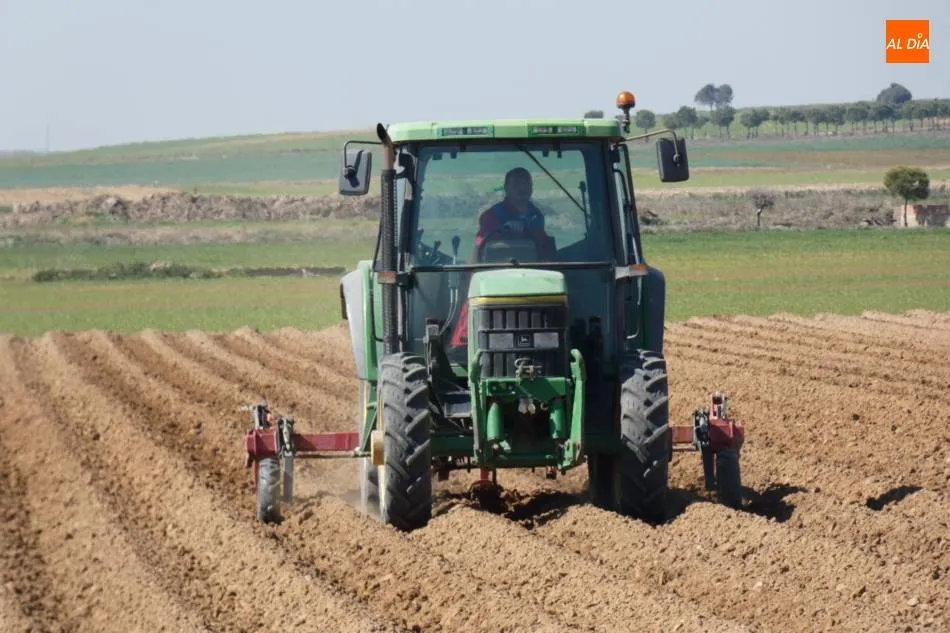 El agricultor Jorge Alonso de Cantalpino estaba ayer realizando una labor de cultivador estanqueador en la parcela que sembró antier de patata, variedad spunta. El pase de este apero deja pequeñas pozas entre cada caballón, que tienen por misión retener el agua para hacer más efectivo el riego.