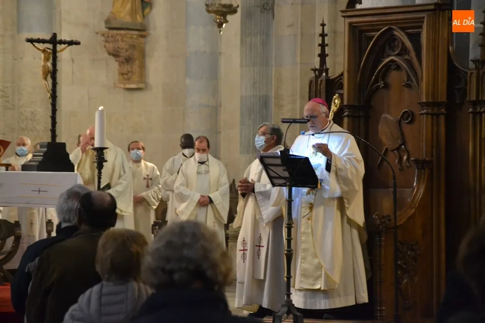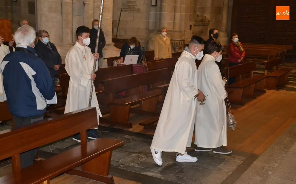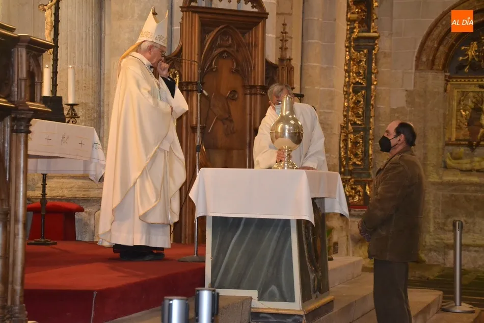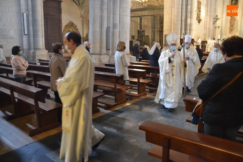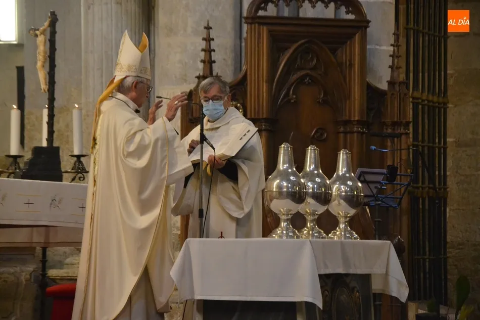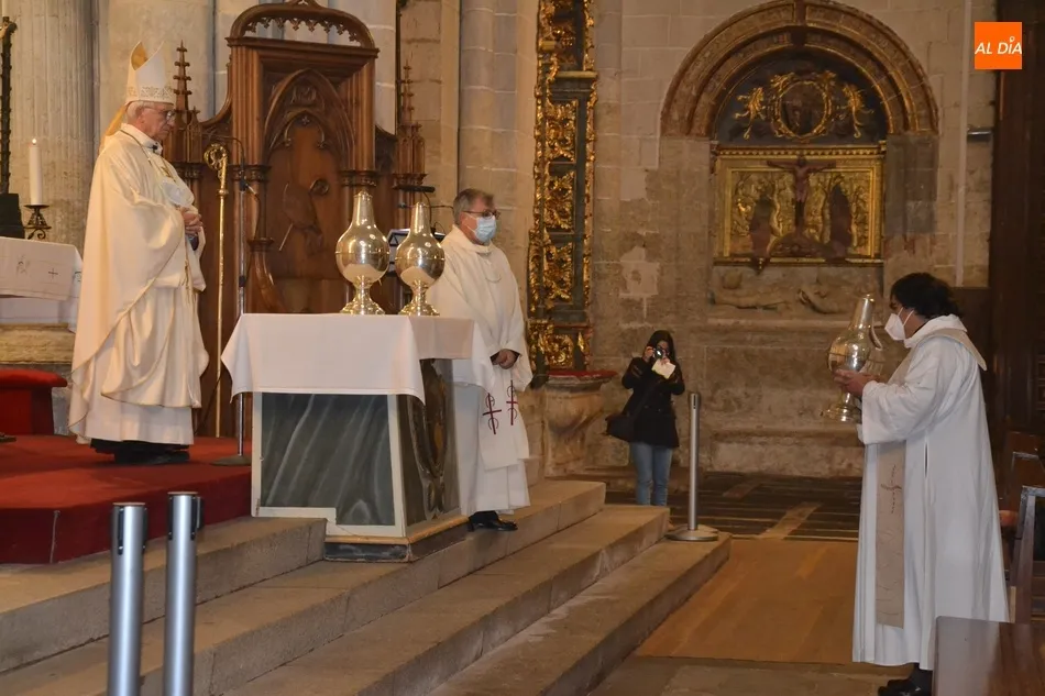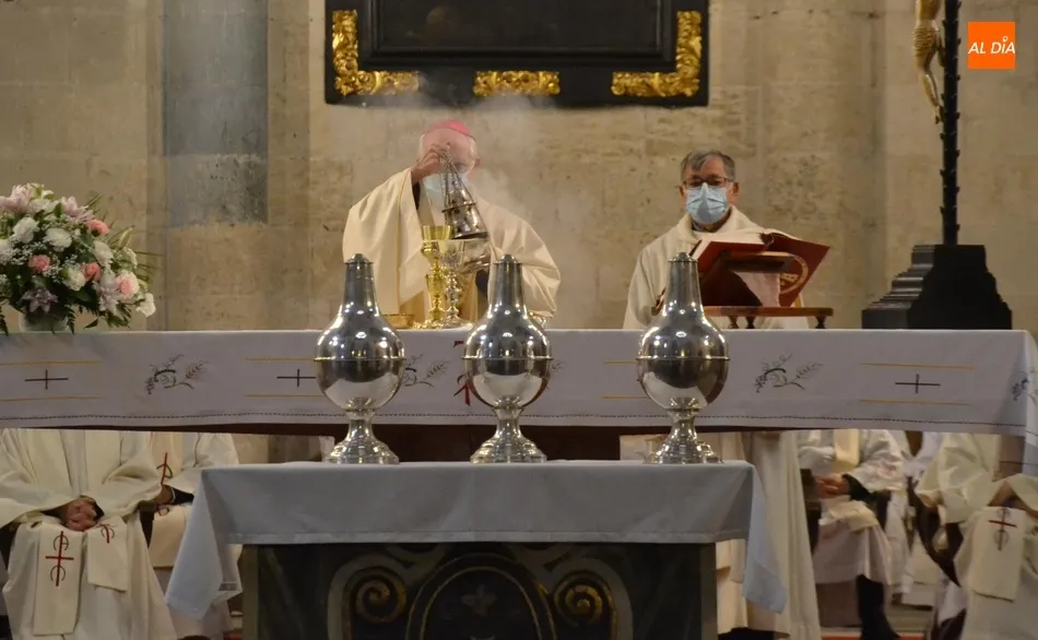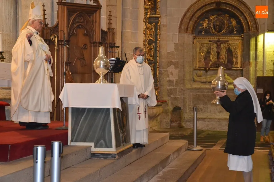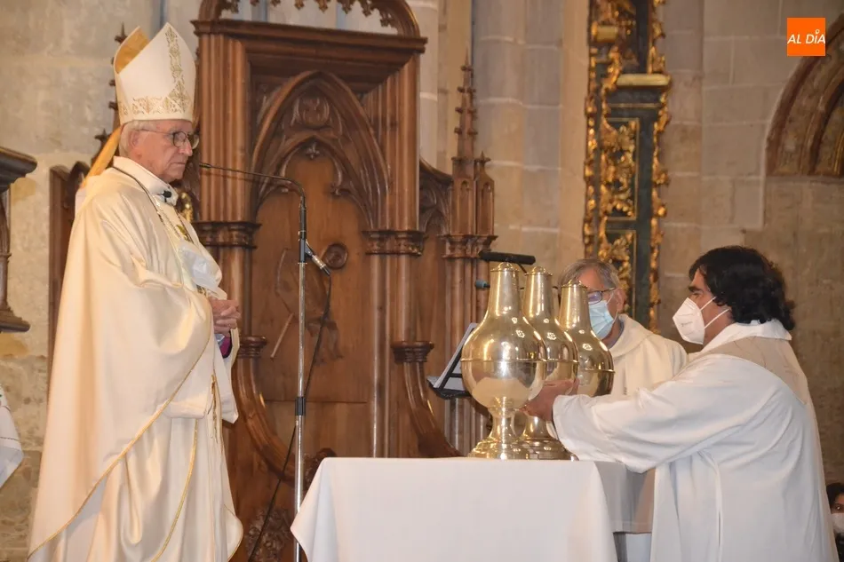 Recuperando la tradición perdida el año pasado por culpa de la pandemia del coronavirus (al caer la Semana Santa en la época de confinamiento domiciliario, se trasladó al mes de junio, cuando ya estaban reabiertos los templos), la Diócesis de Ciudad Rodrigo celebró en la mañana del Martes Santo en la Catedral de Santa María la Misa Crismal, considerada ?la principal celebración del Obispo con sus presbíteros?, según señaló durante la misma el Administrador Apostólico de la Diócesis, Jesús García Burillo.