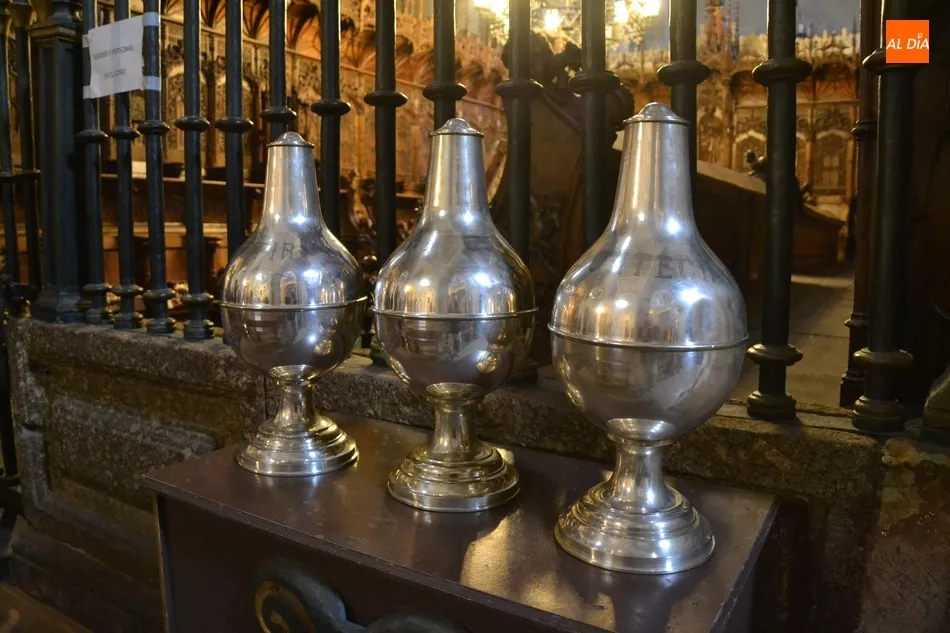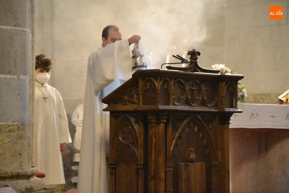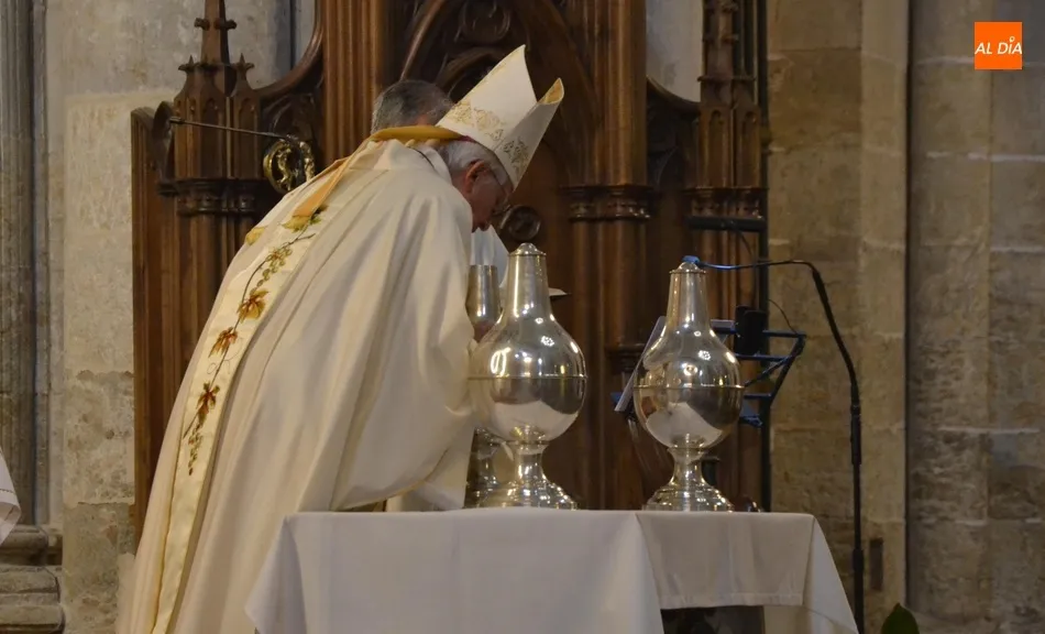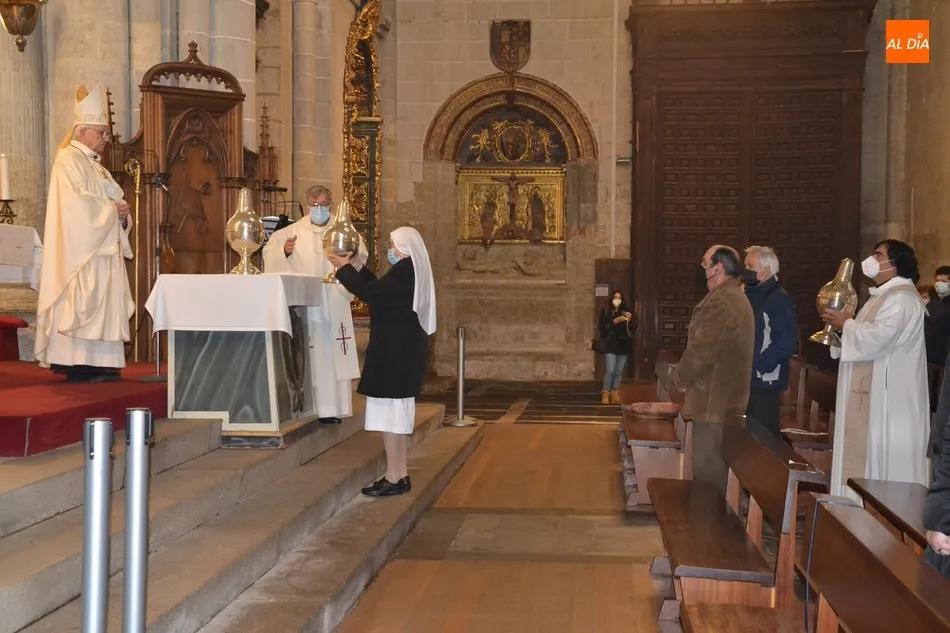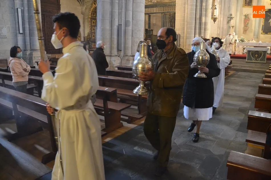 Por otro lado, durante la misa se consagró (de ahí el nombre de la misma) el Santo Crisma que será usado a lo largo de este año para impartir los sacramentos del Bautismo, la Confirmación y el Orden Sacerdotal. Asimismo, se bendijeron los óleos, el de catecúmenos para los bautismos y el de los enfermos. Esos ungüentos fueron acercados al altar para su consagración y su bendición por varias personas, recordando Jesús García Burillo que el Santo Crisma solía acercarlo Alfredo Ramajo, de cuyo fallecimiento se cumplirá un año este miércoles.