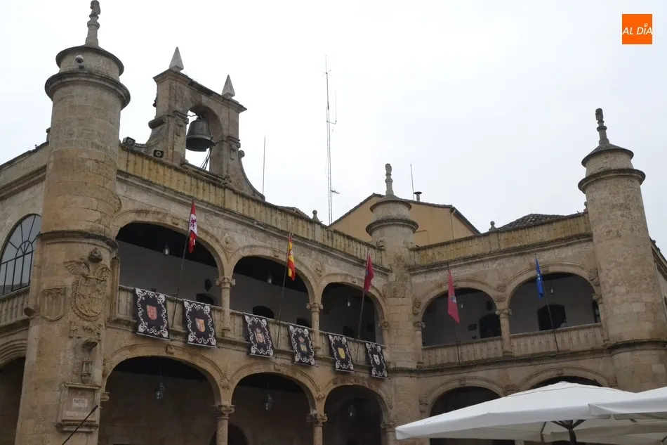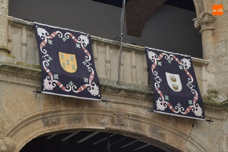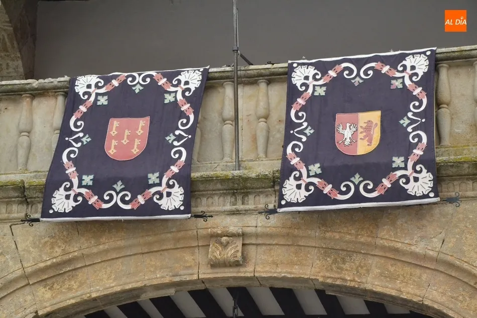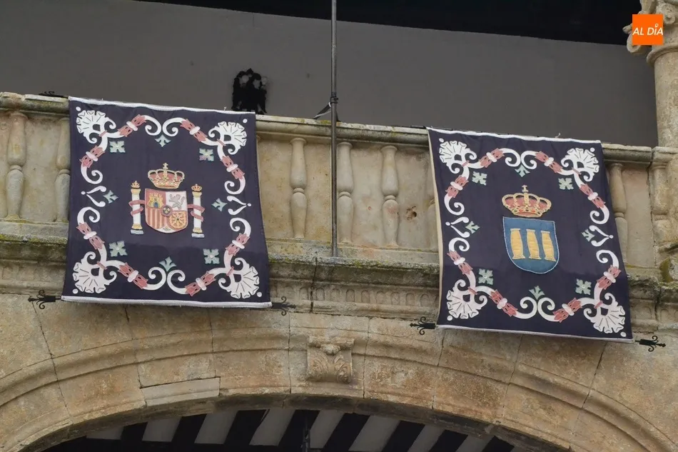Desde hace unos días, la fachada de la Casa Consistorial de Ciudad Rodrigo luce en su balconada los clásicos reposteros que se colocan en la misma cada año con motivo de la celebración de la Semana Santa (de hecho hasta se colocaron el año pasado pese a que coincidió con la época de confinamiento domiciliario y por ende apenas pudieron ser vistos por nadie a pie de calle). Estos reposteros se añaden a la nutrida ornamentación semanasantera que tiene estos días el ágora mirobrigense, con las lonas-posters con las imágenes de los pasos de las cofradías de Ciudad Rodrigo, los emblemas de esas mismas Cofradías, y unas cuantas banderas de España colgadas en varios balcones.