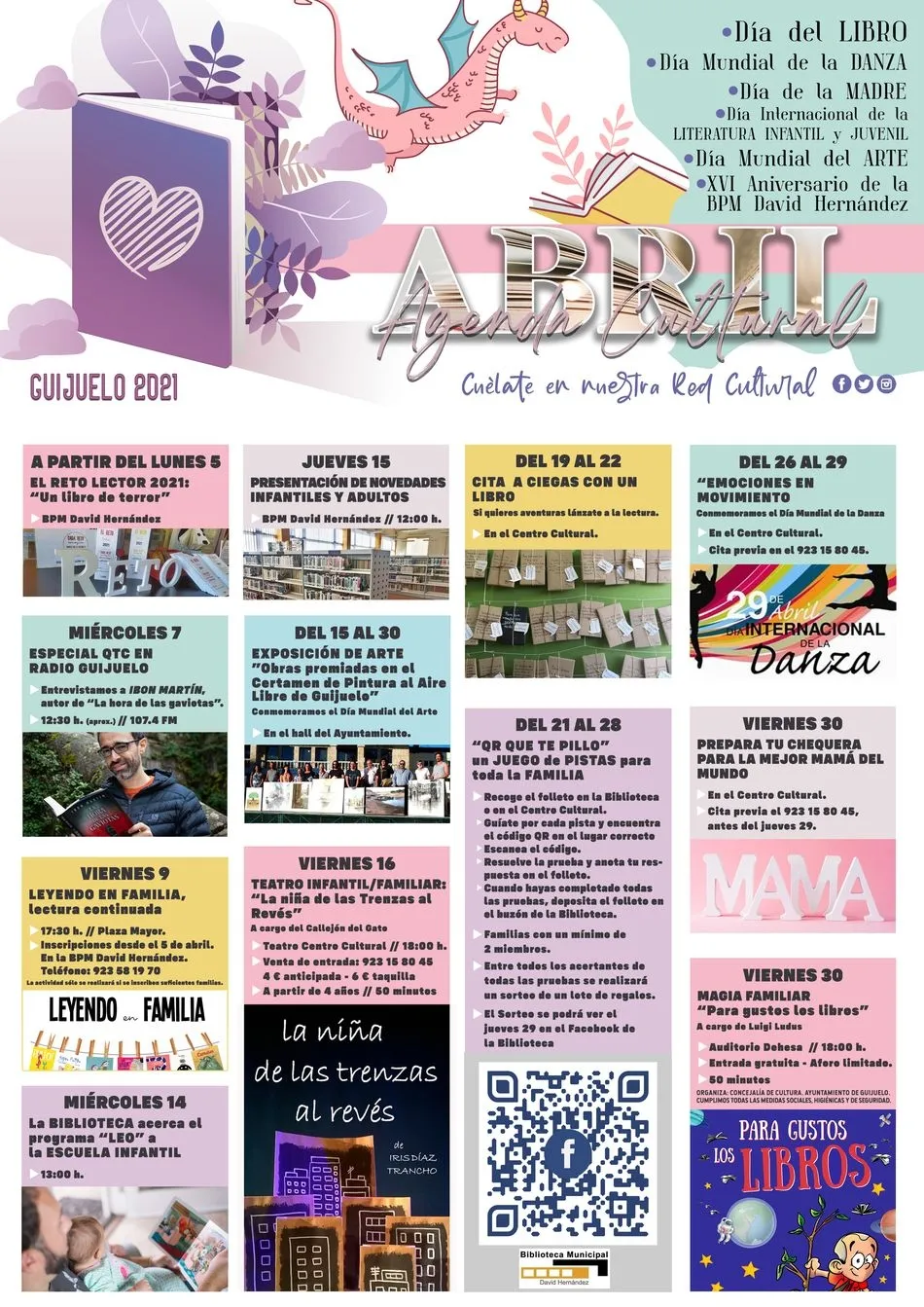 Entre las propuestas para el mes de abril destacan las citas del 23 de abril, en el que coinciden el XVI aniversario de la Biblioteca David Hernández y el Día del Libro, así como el 29 abril en el que se celebra el Día Internacional de la Danza. Pero en abril además habrá teatro, magia, juegos y otro buen número de iniciativas.
