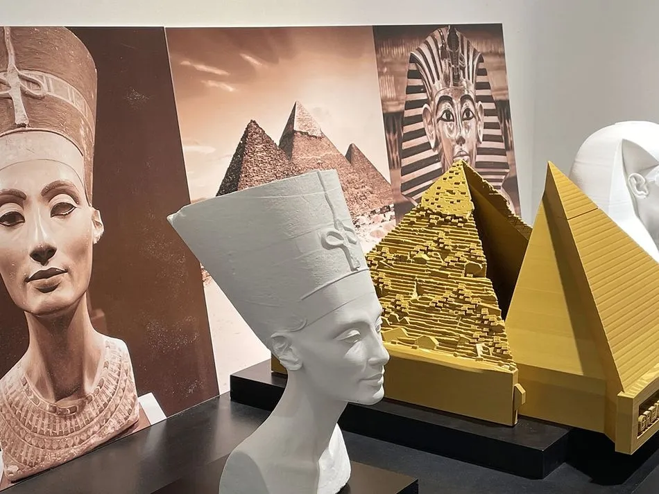 Un toro de Guisando, el Hombre de Vitruvio de Leonardo Da Vinci, La Piedad de Miguel Ángel y el Discóbolo de Mirón son algunas de las esculturas que se pueden apreciar en la muestra, junto a otras propias del arte egipcio como el Busto de Nefertiti (la gran esposa real del faraón egipcio Akenatón) o la Máscara funeraria de Tutankamon. A Egipto también podemos viajar gracias a las pirámides, pero también a otras ciudades ricas en patrimonio como Roma (con su Coliseo), París (con su Torre Eiffel y el Arco de Triunfo) y Bruselas (con su Maneken Pis).