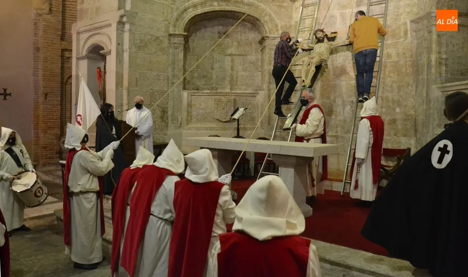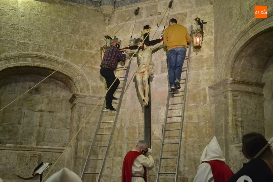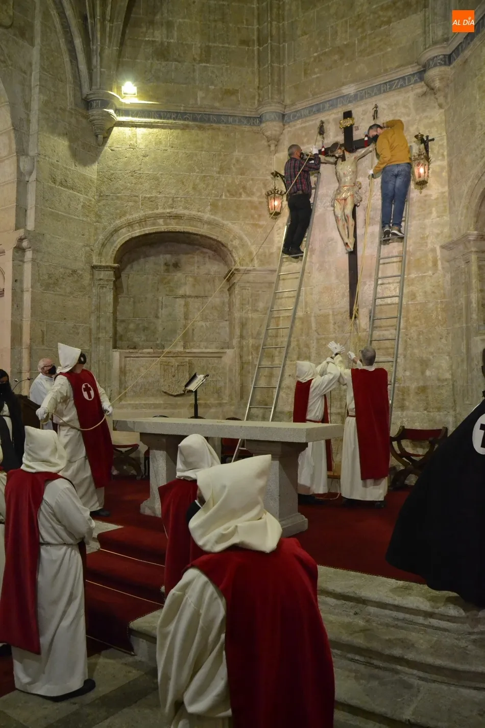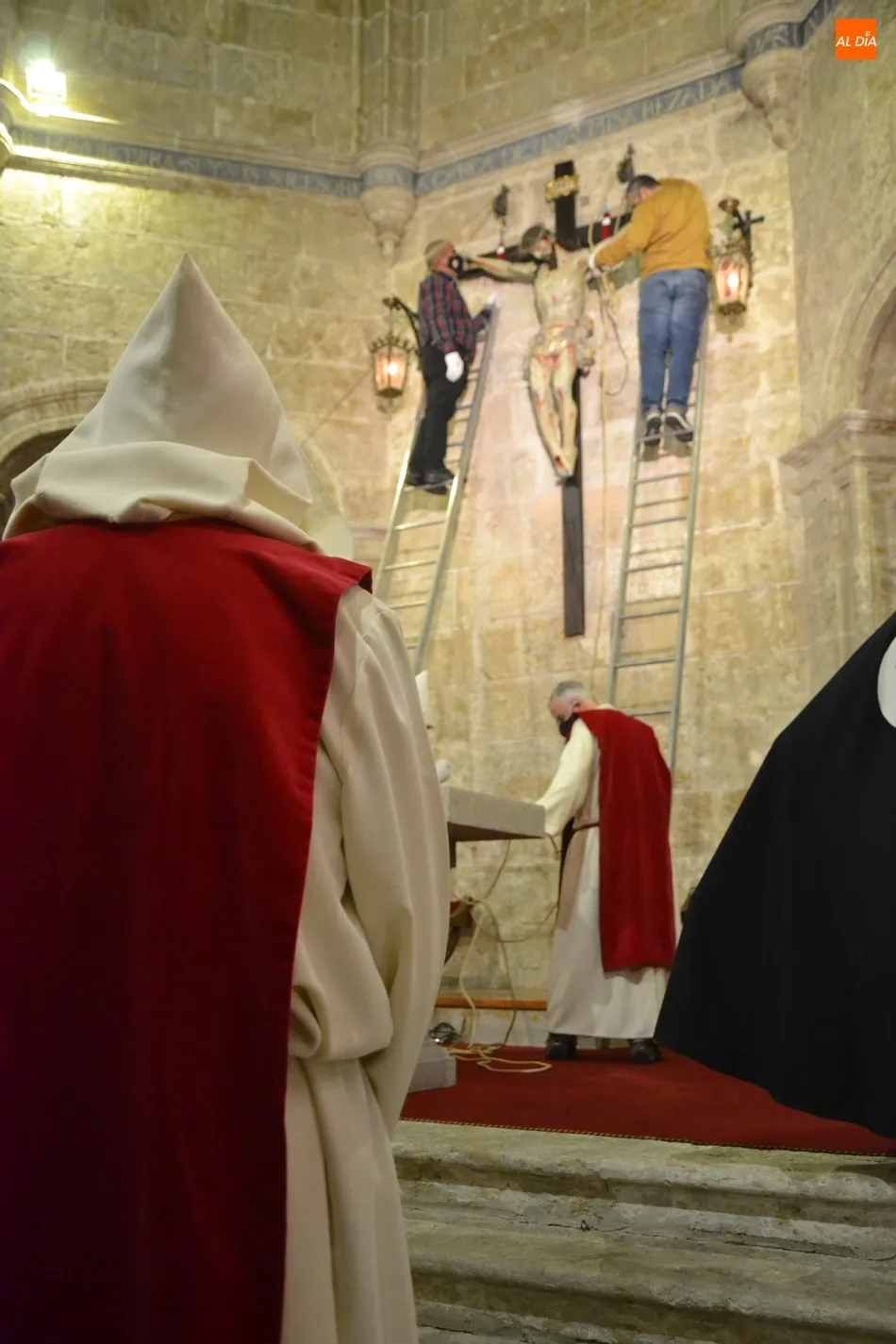 En este sentido, tras la introducción por parte de Ángel Martín Carballo, entraron en escena los miembros de la Cofradía para proceder a bajar la imagen del Cristo del Silencio del ábside de la Iglesia, siendo la segunda ocasión consecutiva en que se baja sabiendo que no es para procesionar (en noviembre ya fue bajado para ser llevado a restaurar). Esta histórica bajada fue seguida de forma solemne por todos los presentes, algunos de los cuales estaban en el interior para rezarle al Santísimo Sacramento.