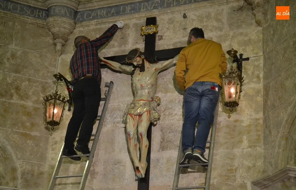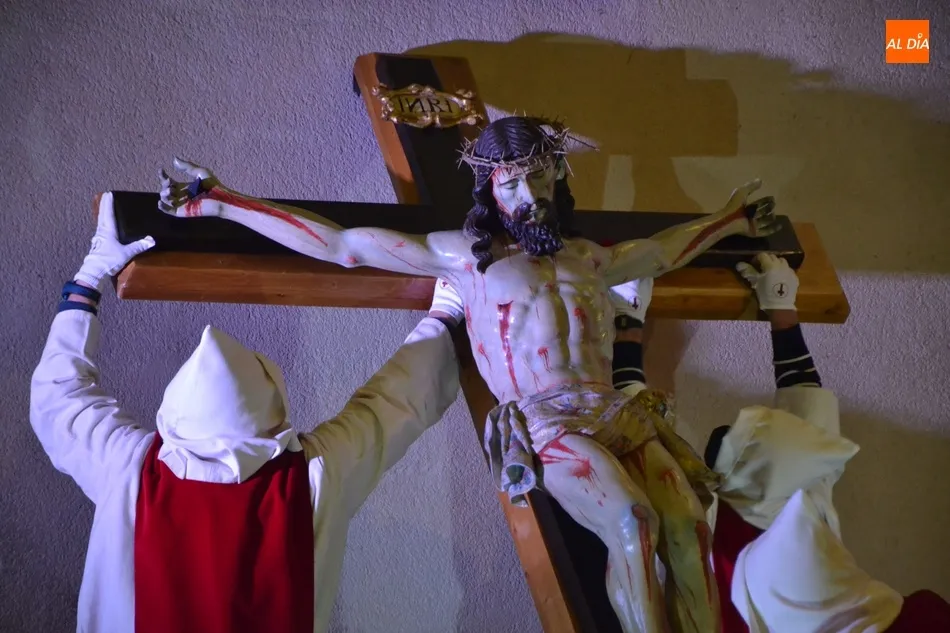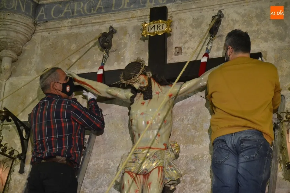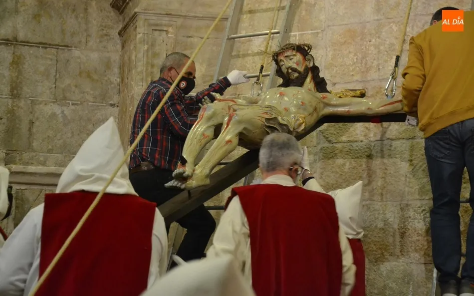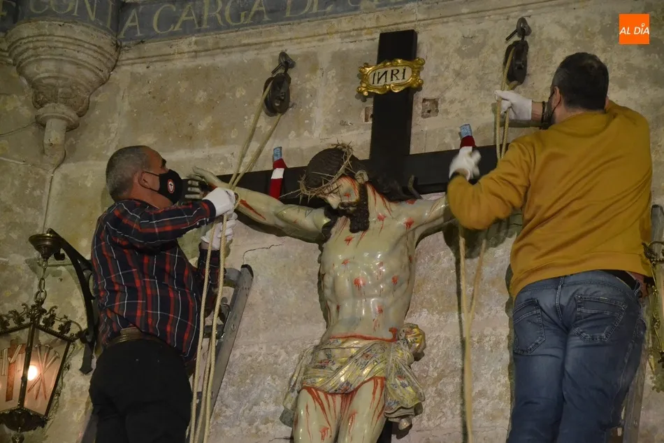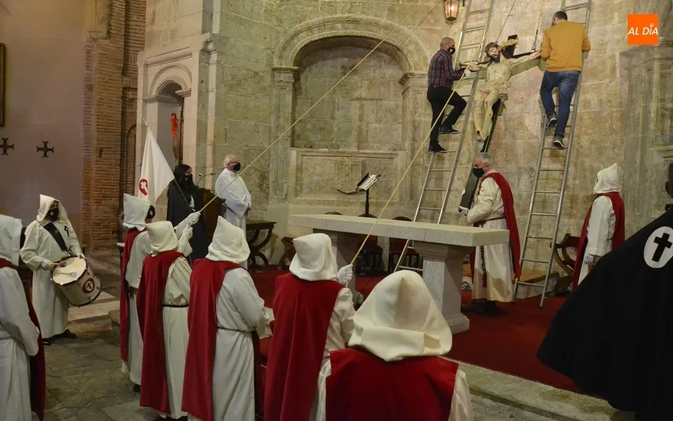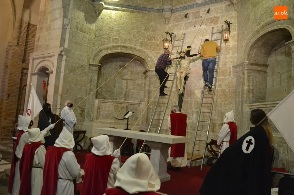 En este sentido, tras la introducción por parte de Ángel Martín Carballo, entraron en escena los miembros de la Cofradía para proceder a bajar la imagen del Cristo del Silencio del ábside de la Iglesia, siendo la segunda ocasión consecutiva en que se baja sabiendo que no es para procesionar (en noviembre ya fue bajado para ser llevado a restaurar). Esta histórica bajada fue seguida de forma solemne por todos los presentes, algunos de los cuales estaban en el interior para rezarle al Santísimo Sacramento.