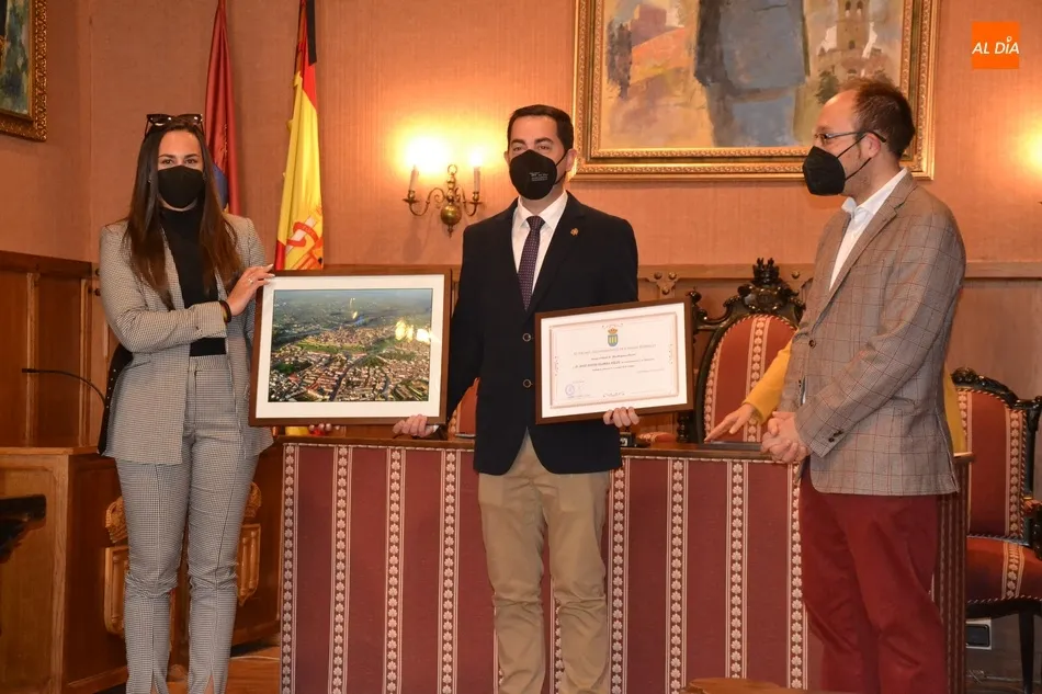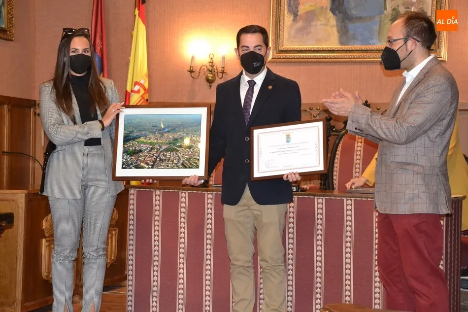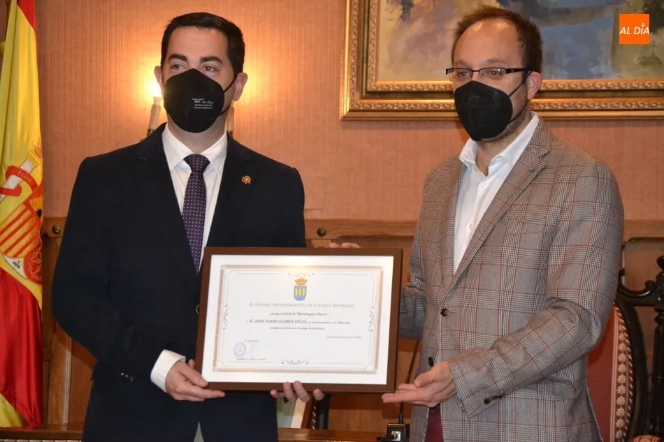 Además de un diploma acreditativo del título de ?Mirobrigenses Ilustres?, José David Flores Félix y Jaime Bajo da Costa recibieron una panorámica aérea de Ciudad Rodrigo enmarcada, finalizando el acto con un ?olé esos mirobrigenses? por parte de uno de los familiares que le acompañaron en el salón de plenos de la Casa Consistorial.