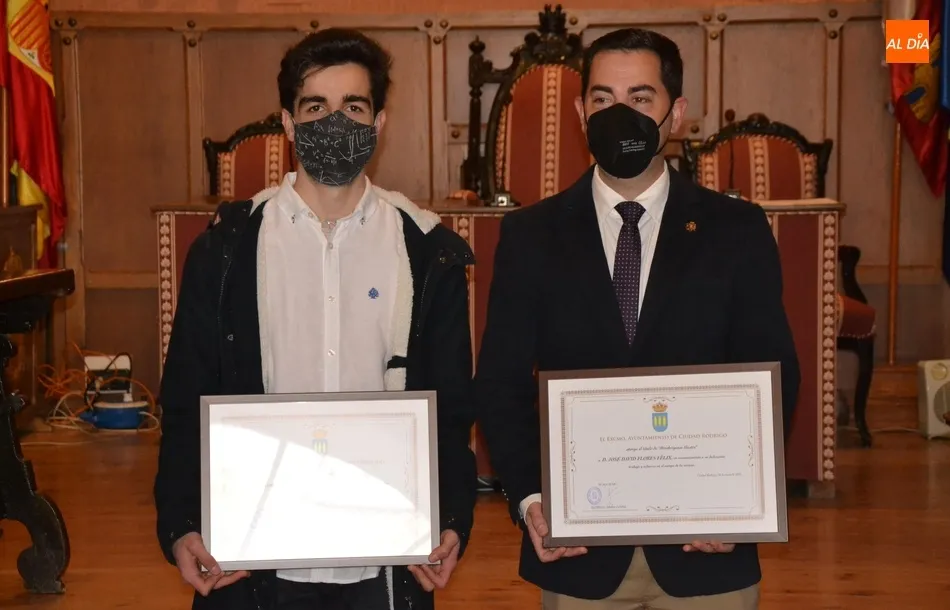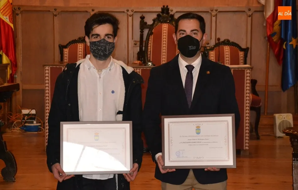 Aprovechando la jornada festiva, el Ayuntamiento de Ciudad Rodrigo hizo entrega en la mañana del Jueves Santo de las distinciones de ?Mirobrigenses Ilustres? concedidas a José David Flores Félix y Jaime Bajo da Costa, quienes no pudieron recogerlas por compromisos laborales y estudiantiles el día inicialmente previsto, el Día de San Sebastián, en el que sí se entregó a título póstumo la tercera distinción concedida este año, a Agustín Sánchez Gómez ?Moriche? (la recogió su viuda y una hija).