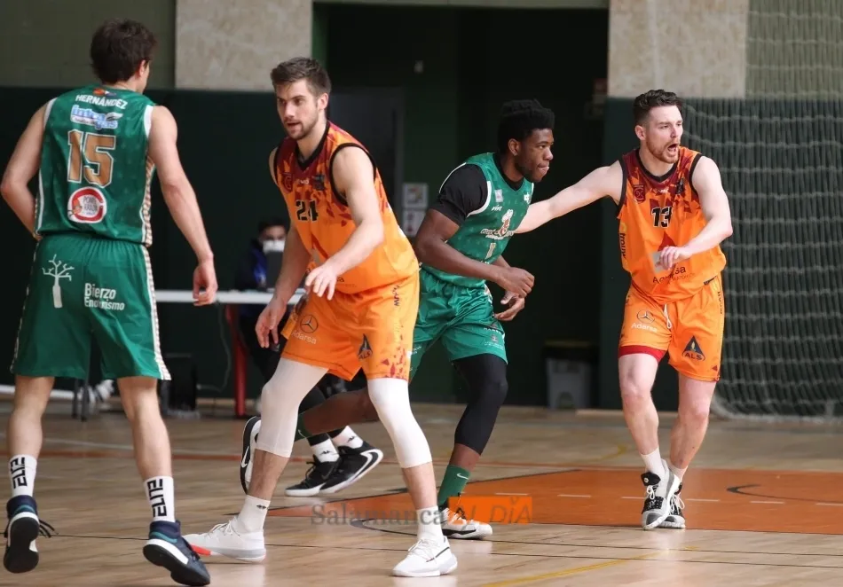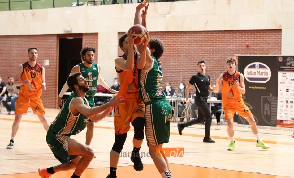 El partido no comenzó bien para los salmantinos, que pagaron sus pobres porcentajes en los tiros de campo (5 de 21) para llegar al final del primer cuarto perdiendo por 7 puntos: 13-20. El equipo berciano llegó a ponerse con 13 puntos de ventaja en el segundo cuarto, pero el Aquimisa tuvo una pequeña reacción para macharse al descanso 7 abajo.