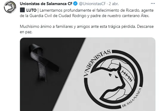 Dentro de esos mensajes, destaca el transmitido por Unionistas de Salamanca, ya que como explican en su tweet, el agente fallecido era padre de un jugador que está actualmente en su cantera, Álex (milita en el equipo Infantil del Club). Asimismo, también han llegado condolencias de otros deportes, como por ejemplo Intersala o el III Columnas, que expresaba que se trata de una ?triste noticia para el deporte mirobrigense sobre todo para nuestros amigos y compañeros del Ciudad Rodrigo CF?.
